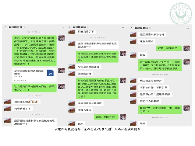 为深入研究中小学生安全教育现状,分析城乡教育安全教育差异,教育学专业尹建锋副教授指导“全心全益•育梦飞翔”云端社会调研团队,带领学生完成对和县中小学生安全教育的实践调查。根据专业的教育学知识理论,尹建锋老师及时队团队的调查问卷进行补充,强调老师在调研过程要充分尊重学生和家长的意愿,指导团队进行修正和润色。