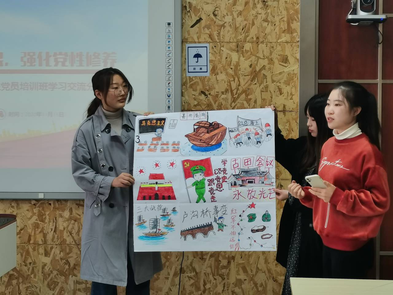 绘画结束后,每组成员代表带着本组的作品在全班进行了分享和展示。第一小组成员以党课班的四次理论学习为切入点进行构思,红色经典中汲取精华,忆古思今中传承红色基因,不断提升自我,发挥先锋模范作用,并承诺必将不忘初心,牢记使命,继续前行。