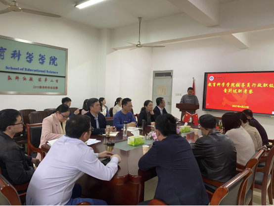 本网讯(教科院 蔡文)2021年4月22日,365英国上市官网辅导员行政职级晋升述职考察在学院308会议室顺利开展。学院党委书记方泓、院长李宜江、院党委副书记杜凤、副院长何海燕、张更立、专业负责人代表、学院科级干部、辅导员以及学生代表共31人参与本次考察,会议由杜凤主持。