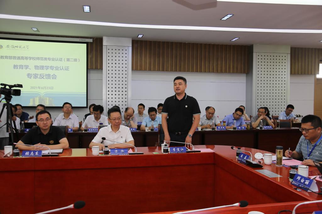 张庆亮代表学校做表态性发言,张庆亮校长强调此次认证工作是对我校教育学和物理学一次综合性的“整体把脉”和系统性的“全面体检”,并要求相关师范类专业学院要提高思想认识,着力在对标对表上下功夫;聚焦问题导向,着力在整改落实上下功夫;深化内涵发展,着力在提升质量上下功夫。
