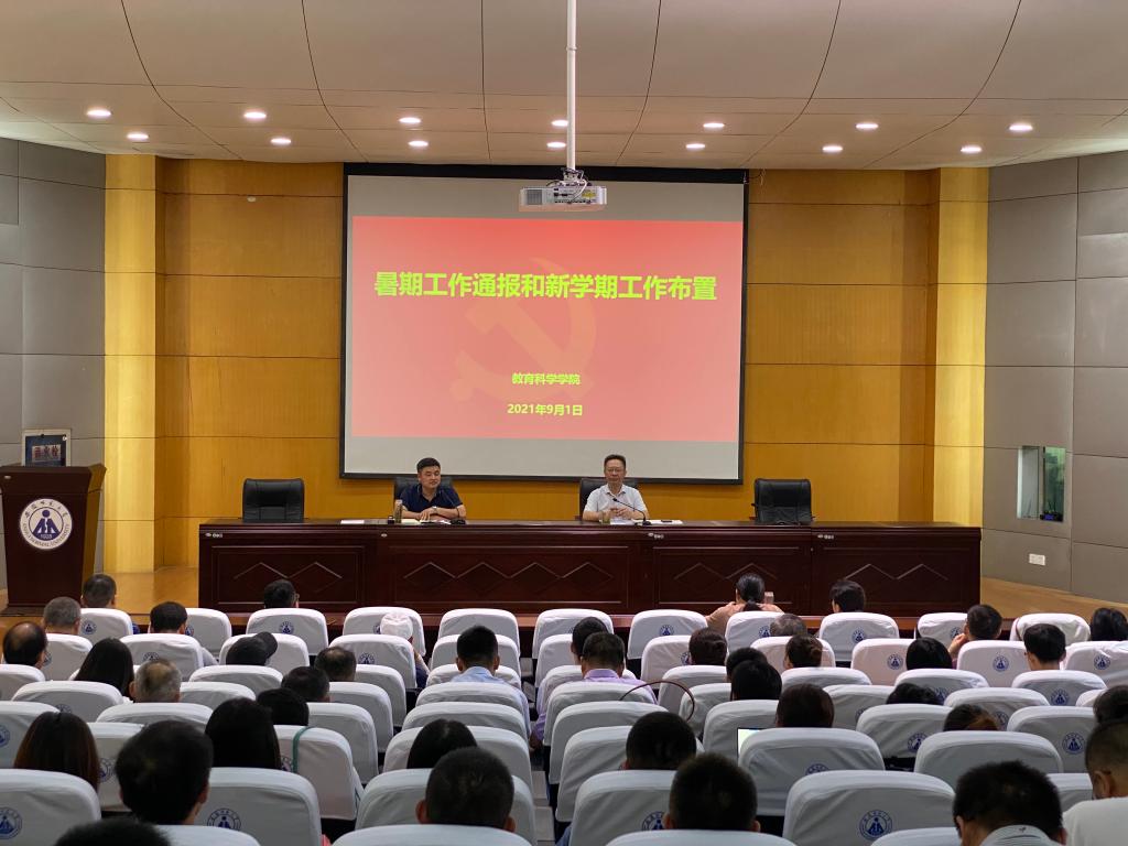院长李宜江从教学、科研、社会服务等多方面通报了暑期学院工作,并就新学期工作进行部署;他强调,全体教职工要始终牢记为党育人、为国育才的重要使命,坚持用高标准要求自己,强化红线意识,加强师德师风修养,认真努力工作,不断营造良好院风教风学风,为开创学院高质量发展新局面作出应有贡献!方泓在总结讲话中指出,新学期要以党史学习教育和“四史”学习为重点,持续加强全院师生政治理论学习,进一步强化师生思想理论武装;要以贯彻落实学校2021年度师德专题教育实施方案为抓手,持续推进师德师风建设,教育引导全院教职工争做“四有”好老师;要以全面落实巡察问题整改为目标,紧扣学院整改台账扎实开展巡察整改工作,力求高质量高成效完成巡察整改任务;要以增强党的领导力组织力为核心,持续推进学院管党治党工作,从严从实全面加强学院党委和党支部建设,为学院高质量发展提供坚强的政治保证和组织保障;要以维护师生生命安全和身体健康至上,持续抓好学院常态化疫情防控工作,教育广大师生严格遵守疫情防控有关制度,积极支持和配合疫情防控管理工作,为学院事业发展营造安全安定的良好环境。