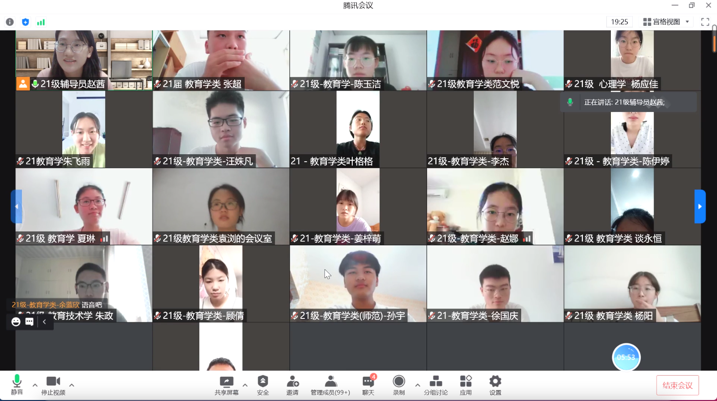 9月10日,恰逢教师节来临,教科院积极落实疫情防控要求,于腾讯会议平台举行了2021级全体本科新生第一次线上班会。院党委副书记杜凤、新生辅导员赵茜、张理强以及21级全体本科新生参与了此次会议。杜凤代表学院向全体新生表示热烈欢迎与衷心祝贺,并就教科院的历史发展、师资力量以及专业情况等方面进行介绍。杜凤指出,新生入学后要学会独立,主动规划,把握未来。此外,杜凤勉励大家要好好学习,提升自我,以此来感恩父母、感恩亲人、感恩师长、感恩祖国、感恩伟大的新时代!两位辅导员也就辅导员工作、大学生活等内容进行了介绍,并勉励大家打牢基础、刻苦学习,争做有理想信念、有担当意识、有过硬本领、有奋斗精神的时代新人。