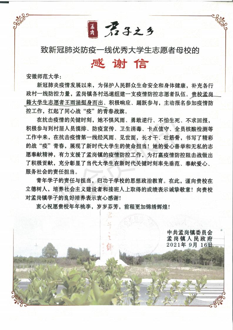 2021年暑假期间,河南省突发疫情,河南省孟岗镇政府迅速反应组建疫情防控志愿者队伍,2020级学前教育专业本科生雨涵积极响应当地政府号召,主动报名参加疫情防控工作。王雨涵积极参与到村镇人员摸排、防疫宣传、卫生消毒、卡点值守、全员核酸检测等一系列防疫工作,她不怕苦累、不求回报的精神展现了教科学子的青春风采与当代大学生的使命担当。王雨涵在防疫志愿工作中的优秀表现得到了中共孟岗镇委员会及孟岗镇人民政府的高度表扬,并于2021年9月16日向安徽师范大学发出了感谢信。