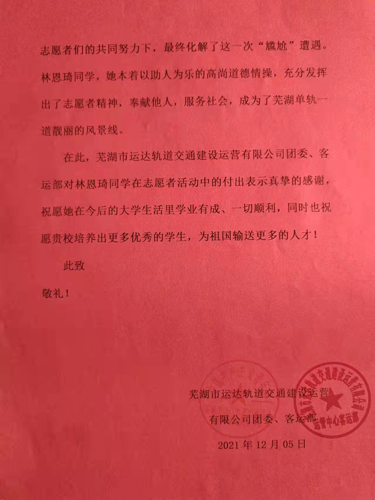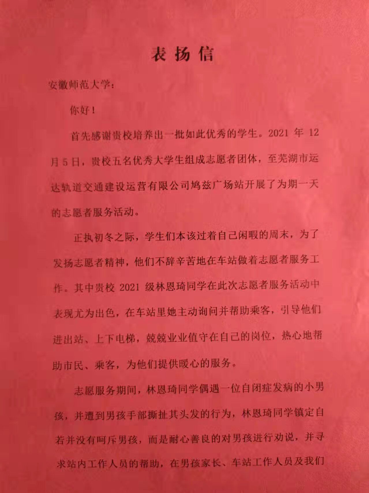 12月5日,2021级教育学类专业的林恩琦于芜湖市鸠兹广场站进行进出站乘客引导维持站台秩序等工作的志愿服务服务当天,林恩琦遇到了一位自闭症的男孩,对于男孩突然发病拉扯她的头发这一行为,林恩琦以善良温暖的劝说代替呵斥与责骂,以冷静客观的态度寻求站内工作人员的帮助。在男孩家长、工作人员以及志愿者的共同努力下,男孩的情绪得以安抚,此次突发事件顺利解决。在为期一天的轻轨志愿服务工作中,林恩琦发扬“奉献、友爱、互助、进步”的志愿者精神,为特殊儿童提供恰当服务展现了大学生独到的处事方法和良好的精神风貌,获得了芜湖市轨道交通工作人员的大力赞扬。