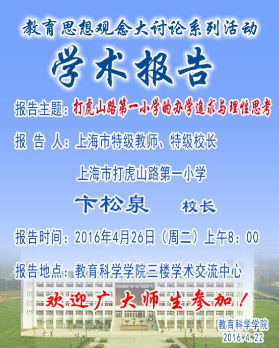 学术报告预告——上海市打虎山路第一小学卞松泉校长学术报告