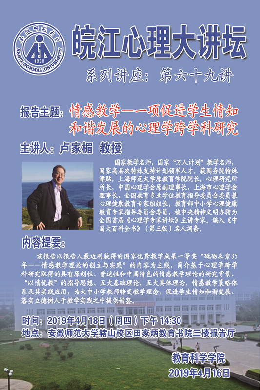 学术报告预告:皖江心理大讲坛第六十九讲——卢家楣:情感教学—一项促进学生情知和谐发展的心理学跨学科研究