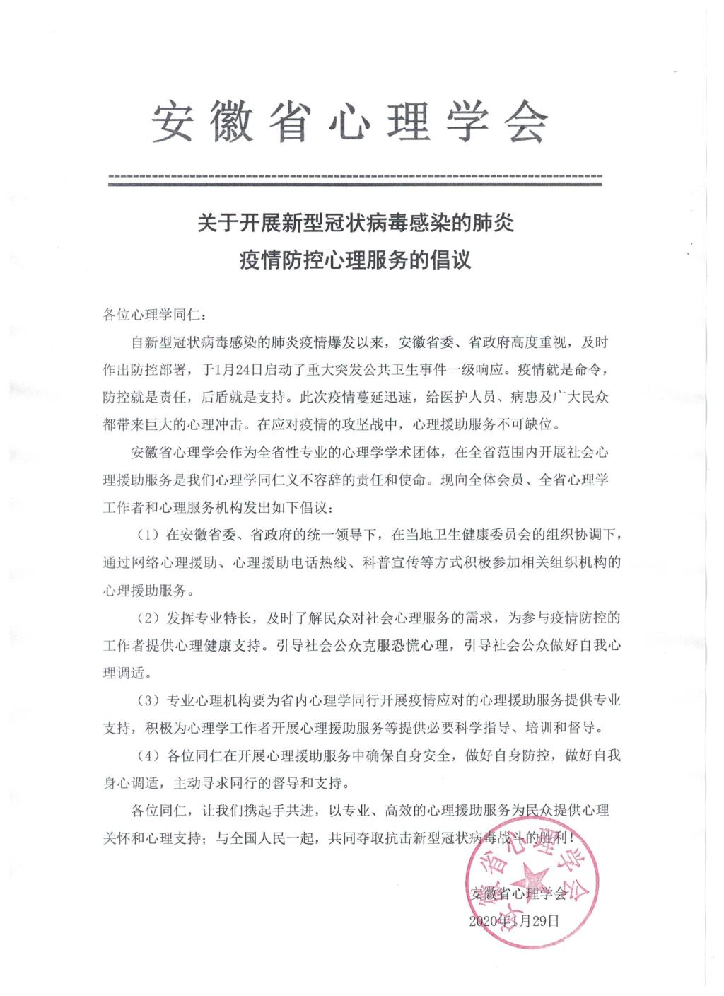 安徽省心理学会发起《关于开展新型冠状病毒感染的肺炎疫情防控心理服务的倡议》