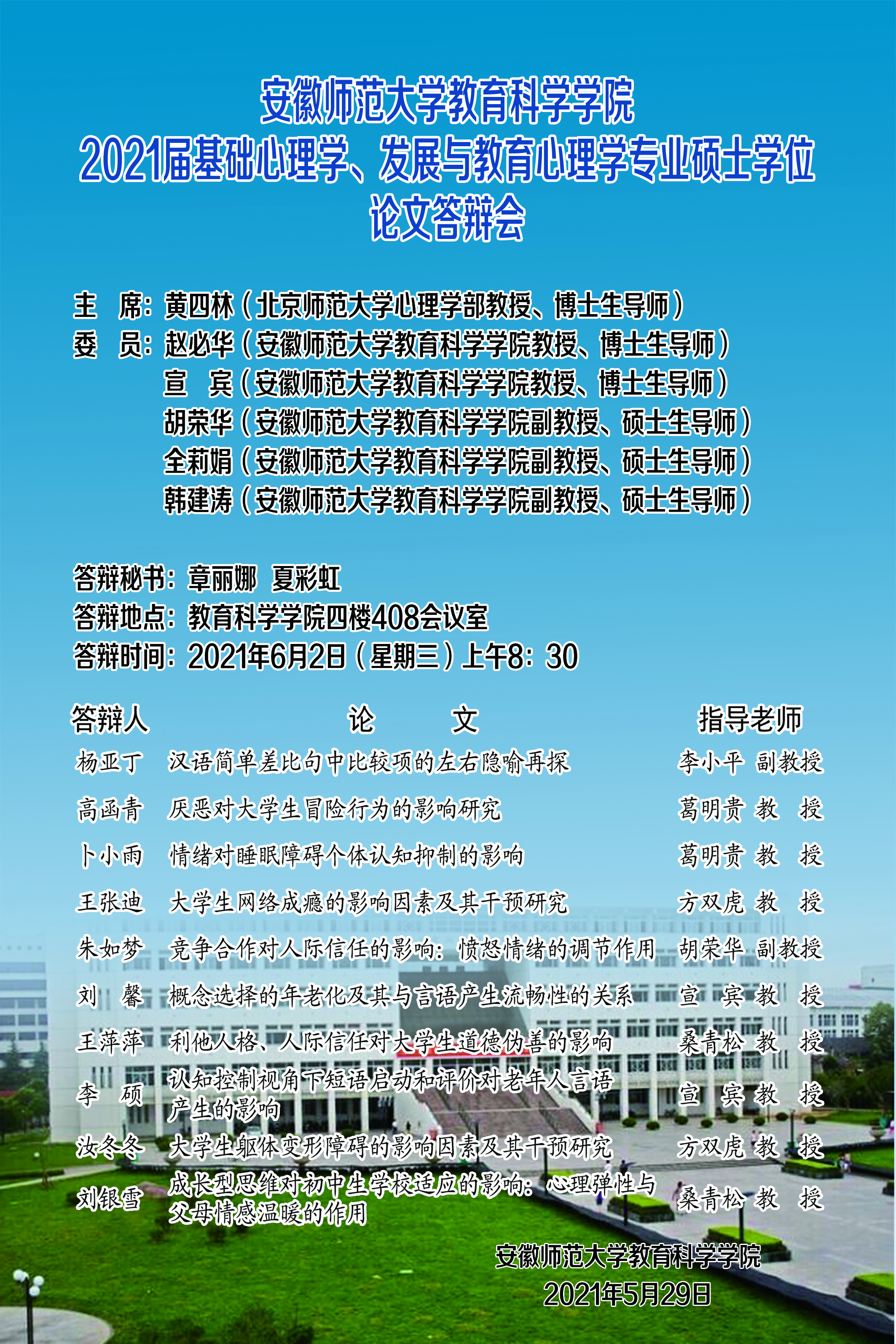 365英国上市官网2021届基础心理学、发展与教育心理学专业硕士学位论文答辩会