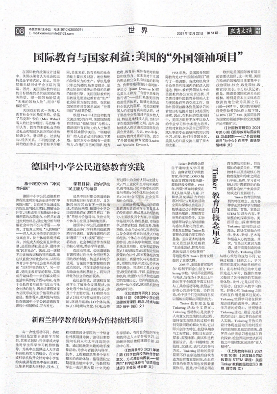 近日获悉,《上海教育科研》2021年第10期刊发的《深度融合劳动教育与STEM课程:美国Tinker教育的经验启示》一文被《教育文摘周报》2021年第51期转载,文章作者是我院在读硕士裔艳、聂竹明教授。