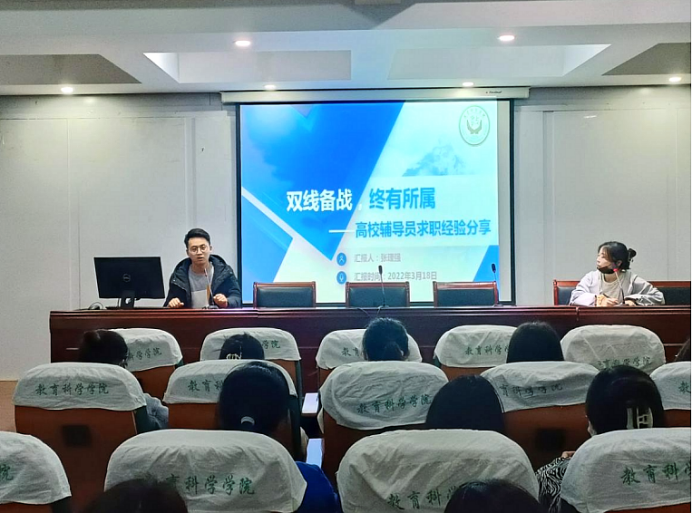 3月18日下午,学院2022届毕业生就业指导分享会——高校辅导员专场在教科院313学术交流中心举行。学院张理强、赵茜两位本科生辅导员应邀进行分享交流,50余名在读研究生参加,分享会由研究生会校友部干事汪宜萍主持。