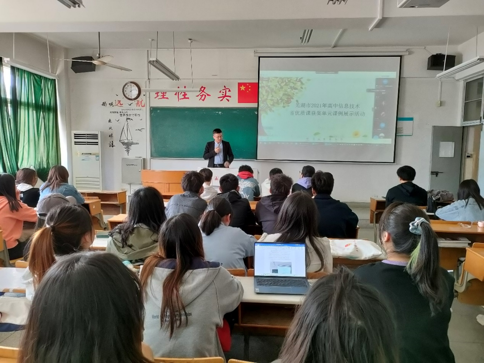 肖文老师介绍了芜湖市选派优秀教师参加2021高中信息技术省优质课比赛的基本情况,详细阐释了高中信息技术优质课设计的主要思路、课堂讲授的特点和取得的优异成绩。他同时结合信息技术学科的特点和教育技术专业的定位,鼓励同学们要打牢教育技术和信息技术学科基础、不断提升教育教学能力,努力成为一名优秀的中学信息技术学科教师和教育信息化建设与管理高素质人才。