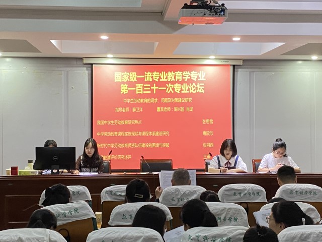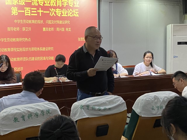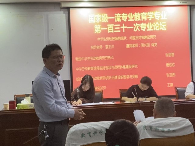 本网讯(文/张思雪 图/谢雅雯)4月10日晚,国家级一流本科专业建设点教育学专业第一百三十一次专业论坛在教科院三楼学术交流中心顺利举行。莅临本次专业论坛有小组指导教师薛卫洋和嘉宾教师周兴国、肖龙,19级、20级教育学专业全体本科生及21级部分教育学类专业本科生到场参加。19级教育学吴君瑜担任主持人。