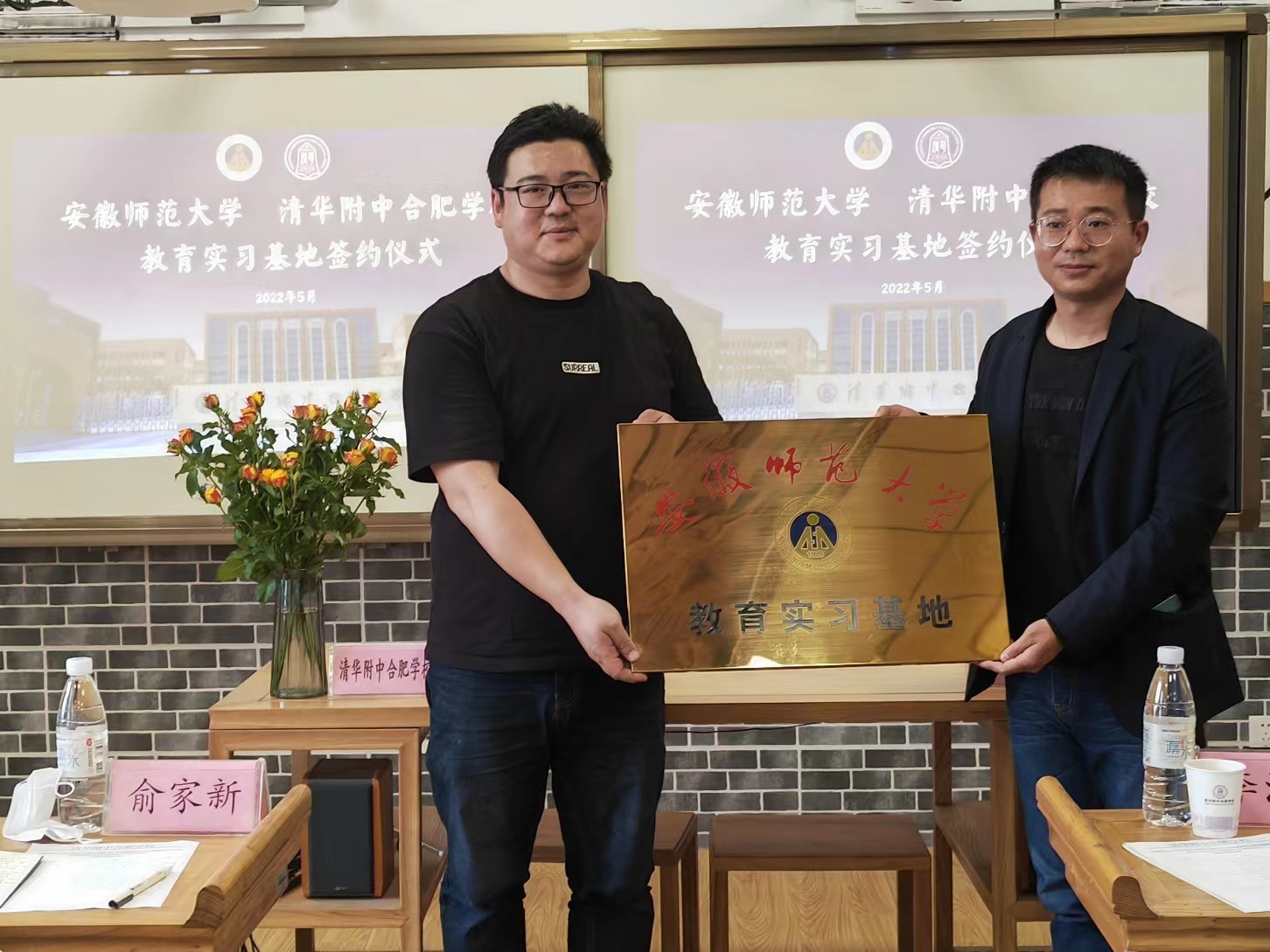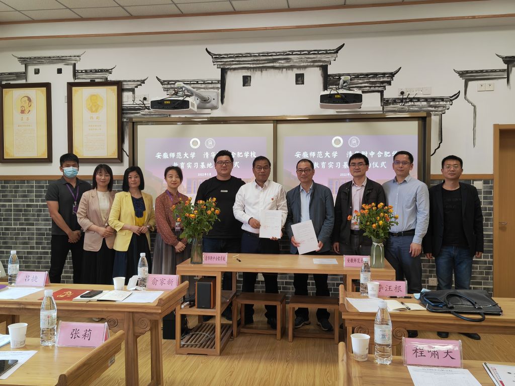 此次实习的圆满结束标志着我院与清华附中合肥学校首次合作的达成。在同学们热烈的掌声中,主持人丁向鸣拉开了签约仪式的序幕。安徽师范大学教务处副处长李汪根与清华附中合肥学校校长俞家新签署实习基地合作协议,并合影留念。在致辞中,校长俞家新对10位实习生提出未来要更努力学习、要热爱生活保持好奇心、要为学习与生活赋予意义三点要求,希望实习生们能在日后的学习、工作生涯中为教育事业贡献出自己的一份力量。随后,教务处副处长李汪根感谢清合对教育学专业教学和人才培养的支持,同时指出要将实习基地发展成集学生见习、实习、教育教学研究的平台。最后,教务处实践科科长程啸天为清华附中合肥学校授予“安徽师范大学教育实习基地”牌匾。
