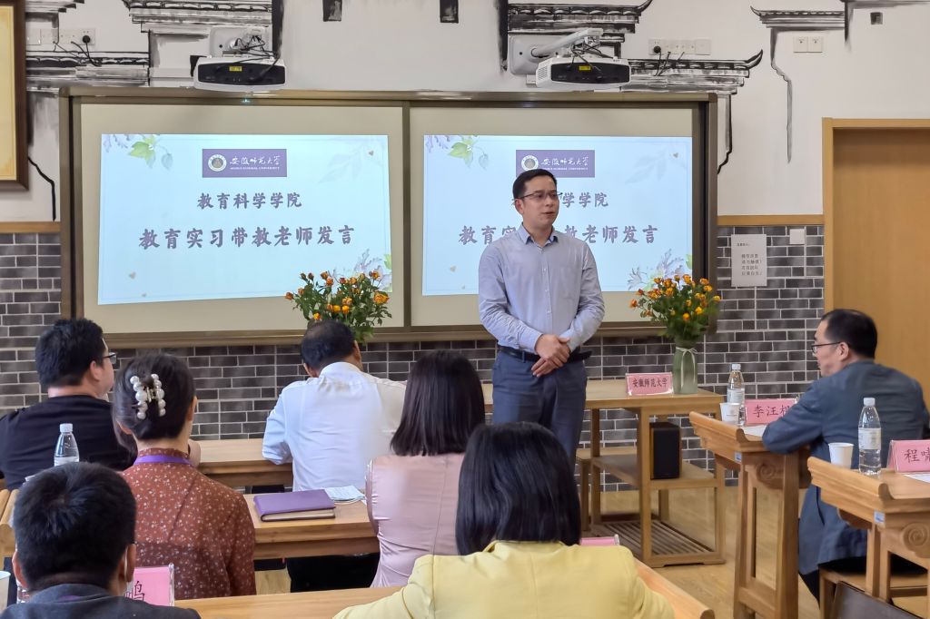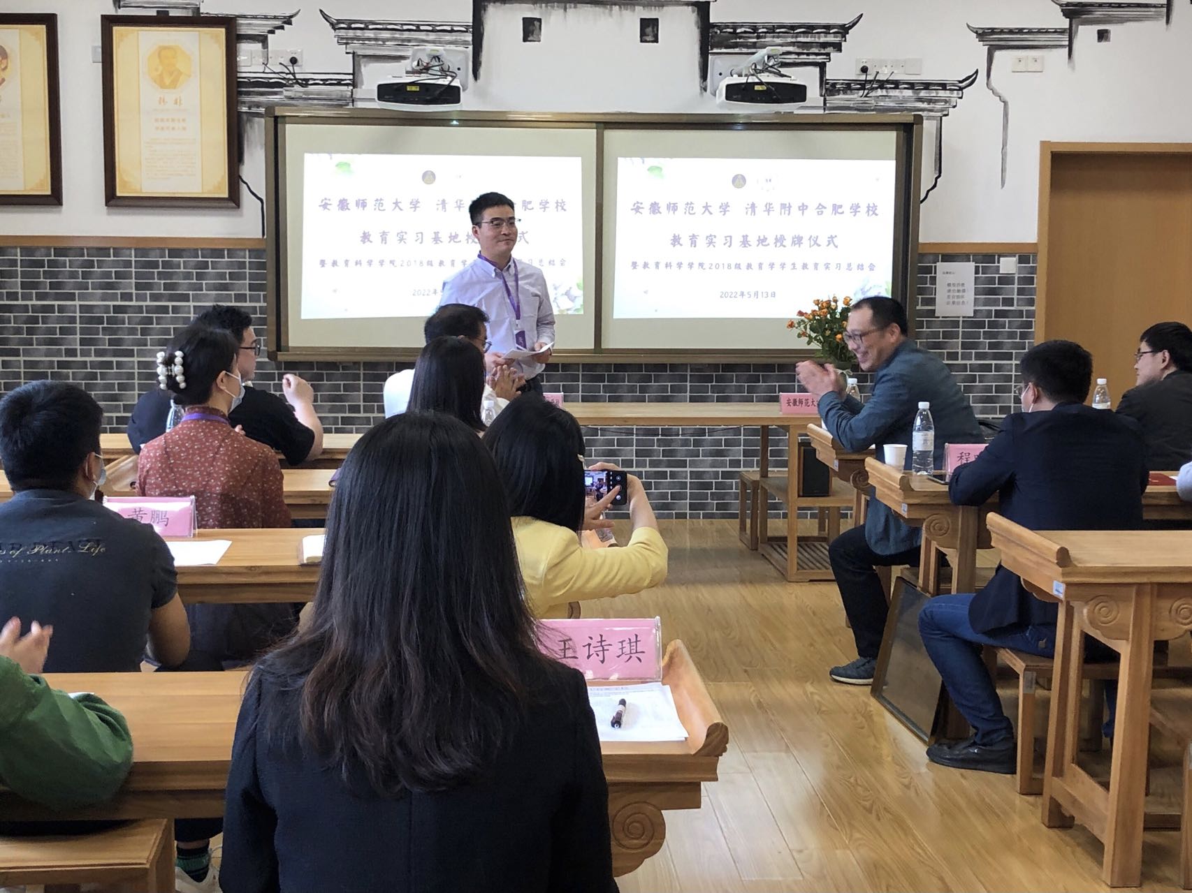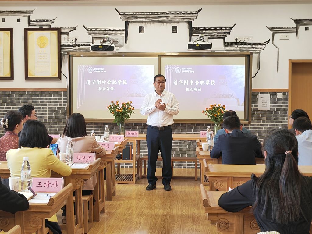 本网讯(教科院 俞晓雨)5月13日,365英国上市官网2018级教育学专业的10名本科生圆满完成了在清华附中合肥学校的近三个月的教育实习任务。当日下午,清华附中合肥学校实习基地授牌仪式暨2018级教育学教育实习总结大会如期召开。教务处副处长李汪根、教科院副院长韩建涛、教育学专业负责人徐赟、教务处实践科科长程啸天以及清华附中合肥学校校长俞家新、行政服务中心召集人吕捷、小学部部长张莉、年级组长潘苗苗、教师发展中心副主任刘晓芳、学生发展中心召集人黄鹏、教学服务中心召集人王诗琪出席了本次会议,会议由年级组长、师大校友丁向鸣主持。