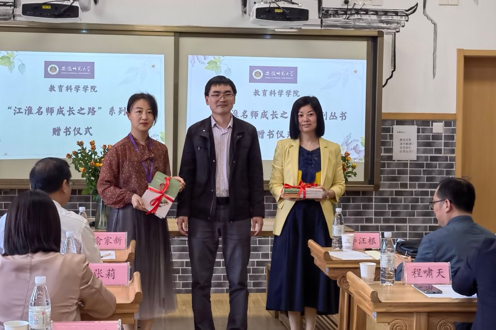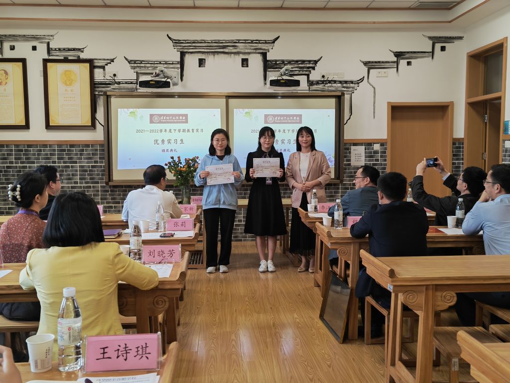 专业与实习基地结合日常表现,秉持着公平公正的原则,评选出李雅馨、邓丽两位同学为优秀实习生,并由小学部部长张莉颁发证书。教科院副院长韩建涛代表学院赠予实践导师“江淮名师成长之路”系列丛书,走进名著,助力清合教师的专业化成长。清华附中合肥学校也为10名实习生准备了纪念品,印有清合校徽的六彩本子、绘本《快乐的诗人李白》以及附有实践老师赠语的明信片等,承载着校园文化,也寄托着对我院实习生的殷切希望。