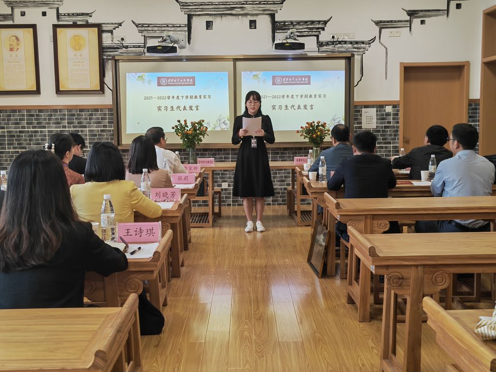 总结会上,教学服务中心召集人王诗琪对教育实习工作进行了小结,她回顾工作的点点滴滴,肯定了10名同学在教育实习过程中的表现。接着,教育学专业负责人徐赟用“祝贺”“感谢”“期待”三个词分别表达了对实习生在疫情背景下完成实习任务的祝贺、对清华附中合肥学校提供实习机会和各项保障工作的感谢,以及学院与实习学校今后合作的期待。随后,李雅馨同学作为实习生代表发言,从教研、教学、班主任工作三方面回顾收获,并对实习学校表达了真切的祝福。
