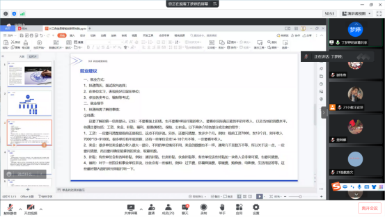 楚琳娜以“疫情常态化下的毕业生求职经验分享”为主题展开,指出疫情期间可通过微信公众号等网络平台获取招聘资源,并分析了如何在疫情背景下提升自己求职能力,提醒同学们要明晰自身职业定位和求职方向,鼓励大家在求职中勇于尝试,不断总结经验、反思成长。张月晨结合自身求职经历,就如何入职专科院校和求职时需要准备什么两个核心问题向大家分别阐述,为同学们解答了当前大家最关心的问题,如工资待遇、跨专业、先择业还是先就业等问题,并告诫大家要树立终身学习的意识。丁梦婷详细介绍了就业方式、工作筛选、求职心态三方面内容,并鼓励大家要保持冷静自信的态度,客观认识自我与就业市场,脚踏实地地寻找合适的工作。