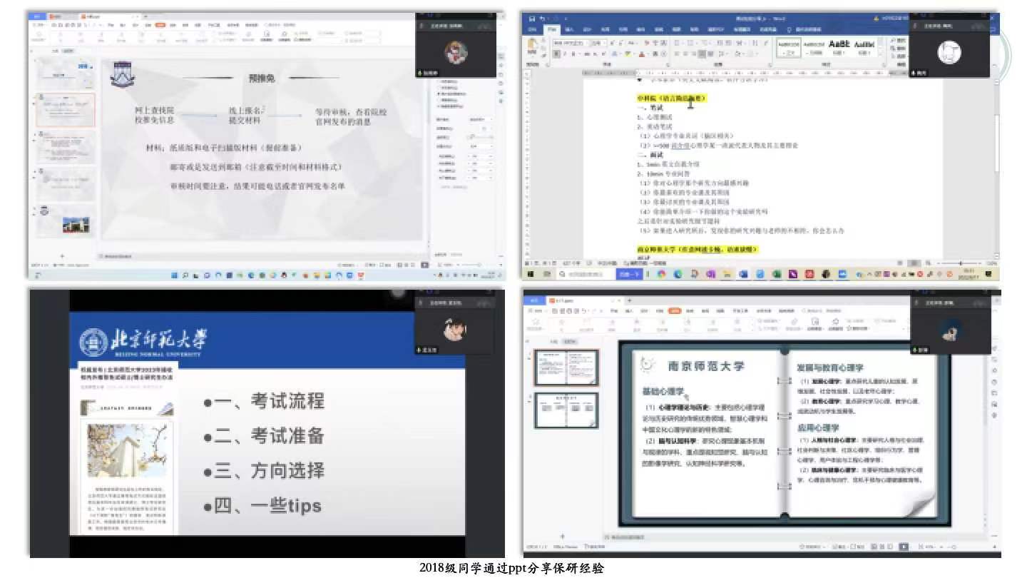 本网讯(教科院 邓心宇)为了帮助2019级心理学具有保研资格的同学们能够更好地应对即将到来的预推免复试,学院邀请了2018级心理学保研成功的五位同学,于2022年9月17日下午在腾讯会议线上平台分享保研经验。本次会议由心理学专业负责人王礼军副教授主持。