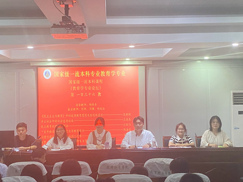 第四位汇报人陈海龙根据《“差序格局”成因探究及其教育启示》的主题展开论述,将“差序格局”与“礼治秩序”、“长老统治”、“儒家思想”相结合,探究“差序格局”在中国乡土社会的形成和发展过程。第五位汇报人王悦晓围绕《〈理想国〉中正义问题与洞穴之喻》这一主题展开论述,聚焦四种美德、正义问题、洞穴之喻三个关键词,得出重教化而非灌输式教育、教育要循序渐进的现实启发。第六位汇报人石金杰以《教育、沟通、生活:杜威教育即生活思想的当代启示》为题,分析教育和生活的关系,探究沟通发挥的桥梁作用,得出教育、沟通、生活三环紧扣对当下我国教育发展的思考。