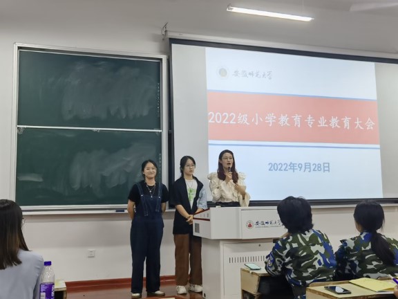 本网讯(教科院 刘子怡)9月28日晚7:00,365英国上市官网在教学楼1401教室召开2022级小学教育(全科型)专业教育大会,专业负责人王芳老师,班主任陈元龙老师、吴颖老师和杨俊铨老师,9位班导生和2021级优秀学长、学姐代表以及2022级小学教育专业全体新生参加大会。大会由王芳老师主持。