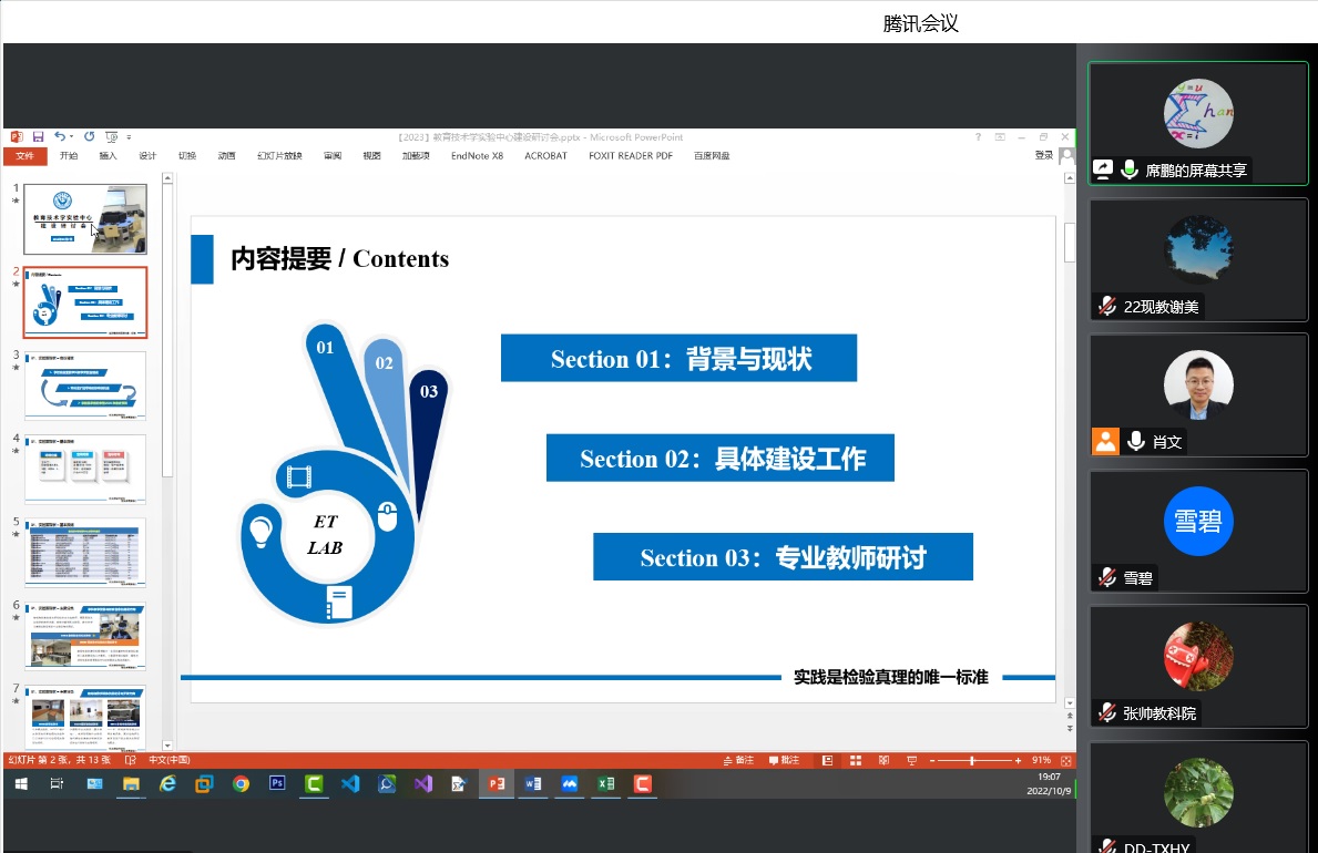 本网讯(教科院)10月9日晚7点,教育技术系线上召开实验室建设研讨会,梳理总结教育技术系实验中心建设有关情况,规划研讨未来发展思路与建设计划。教育技术系骨干教师参加了本次研讨会,会议由专业负责人肖文主持。