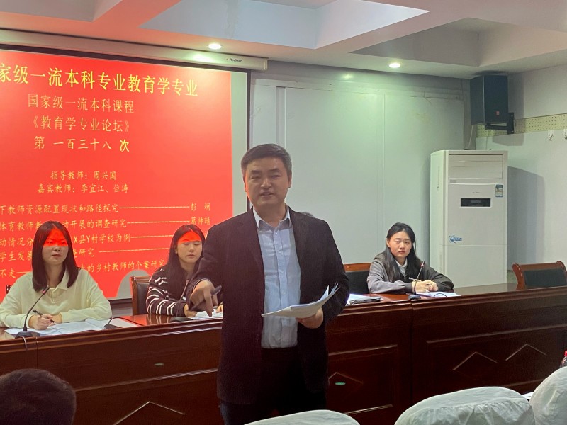 在教师点评环节,嘉宾教师位涛围绕选题、方法、论证和结论四个方面进行详细说明:第一,选题的现实性、问题性;第二,方法的合适性、规范性;第三,论证的完整性、严密性;第四,结论的启发性、创新性。同时,他对汇报同学依次提出可操作性强的建议。紧接着,嘉宾教师李宜江对小组成员的文本与汇报表现进行具体评价,强调要重视选题、研究设计、行文逻辑和表达。此外,他概括了专业论坛的四个课程目标:开阔学科视野、训练学术思维、提升作品表达能力、坚定教育学学科情怀。最后,作为本组的指导教师,周兴国对本次论坛进行总结,并对嘉宾教师和同学们的建议和提问表示感谢。