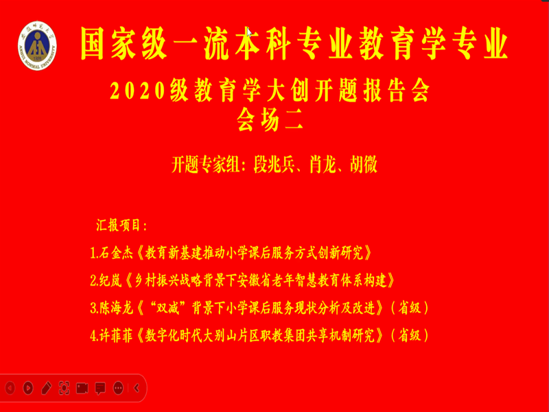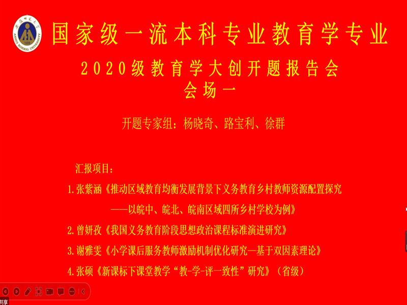 本网讯(文/谢雅雯 图/谢雅雯 乔琳颖)2023年1月6日下午,教育学专业通过线上会议形式举行2022年大学生创新创业训练计划开题报告会。莅临本次开题报告会的指导教师有杨晓奇、段兆兵、路宝利、徐群、肖龙、胡微,20级、21级全体本科生到场参加,并由20级教育学马祎曼、纪岚分别担任会场一、会场二的主持人。