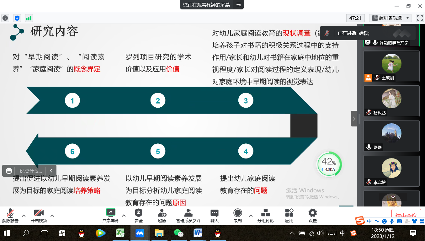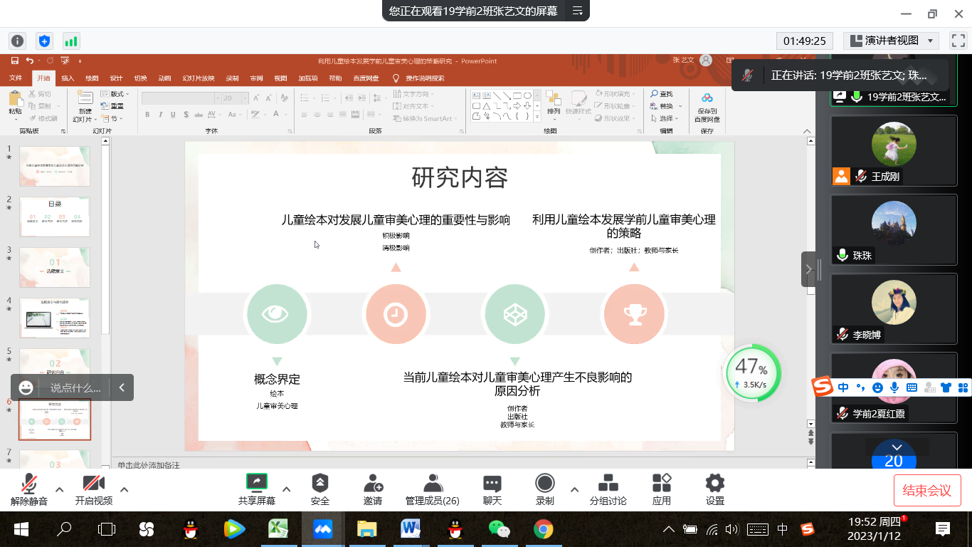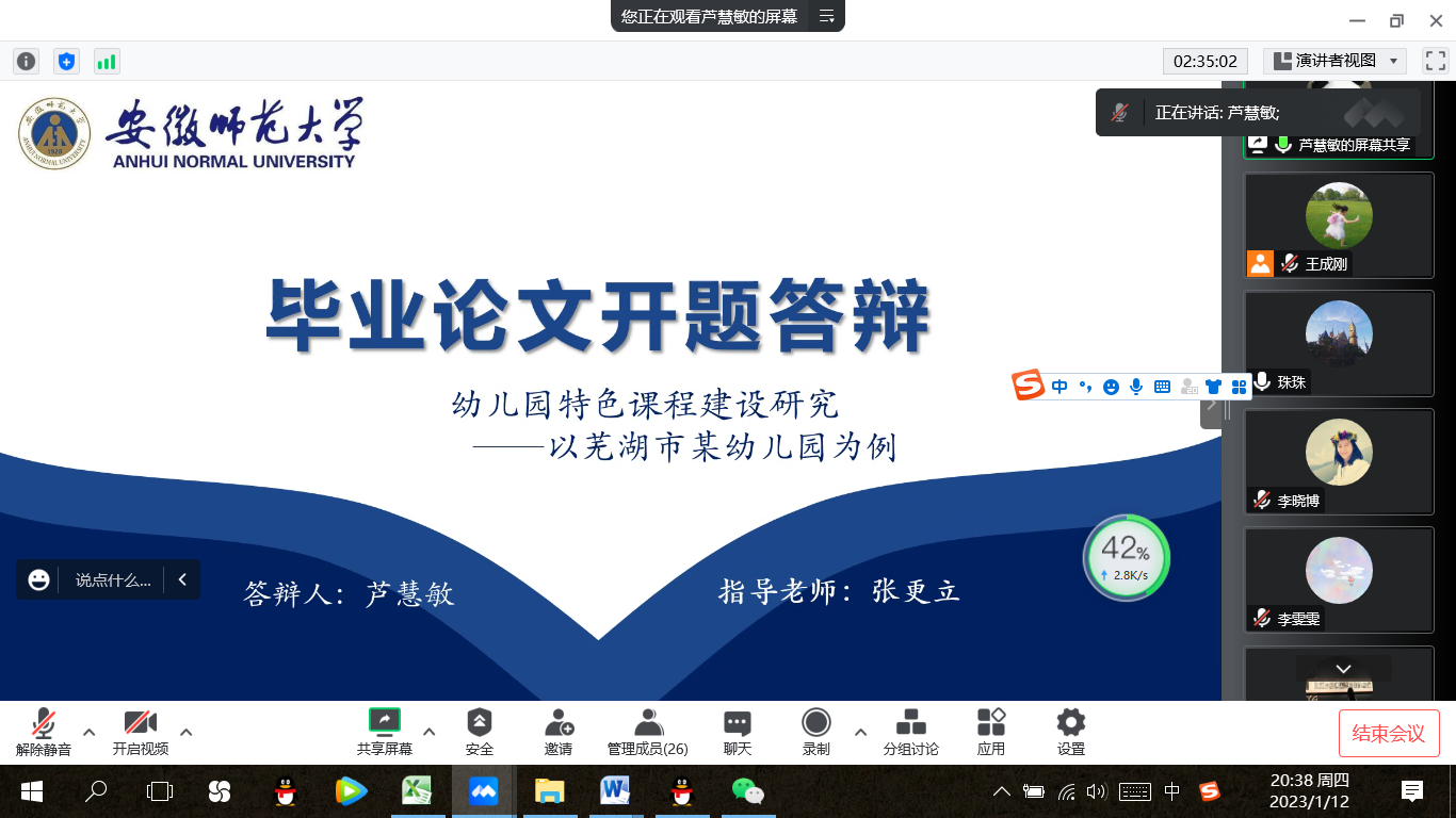 本网讯(教科院)切实做好2023届本科毕业论文(设计)撰写工作,保障本科生毕业论文质量,加强对毕业论文选题和撰写过程的指导与管理。2023年1月12日晚上,在腾讯会议线上举行2023届学前教育专业本科生毕业论文开题报告会。按照指导教师回避本人指导学生为基本原则,本次论文开题分五组进行,张更立、吴玲、孙德玉、赵学菊、朱立新担任五组的组长。参加报告会的还有指导教师张志华、刘婉、陈海燕、李毅恒、翟清华、王芬莲、葛燕、王萍、王成刚、李晓博等人以及2019级学前教育专业全体学生。