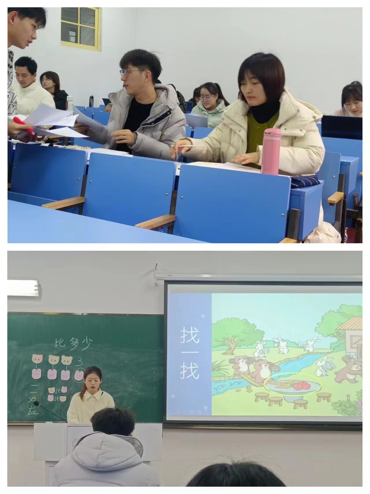 小教(复合型)专业学生三门课程无生上课考核的内容主要是教材中的新课,其中,各学科内也有部分同学开展同课异构活动,组内3-5人共同探究同一主题,体现出了学生对于教材内容的不同解读和教学想法,清晰的普通话、精美整洁的板书、科学新颖的课件、有趣生动的学习活动设计……无不体现了小教(复合型)专业学生的认真、投入和为课程考核所做的充分、细致的准备。三门专业核心课程教学实践考核按时、顺利进行,首先由学生通过亲身体验实践教学,走上讲台,将专业理论教学知识应用于教学实践当中,感受教书育人的心境。最后两位评委老师一一为同学们点评,引导学生从中反思自身的教学需要改进的地方,并给予了宝贵的建议,表示了对同学们的鼓励和期许。