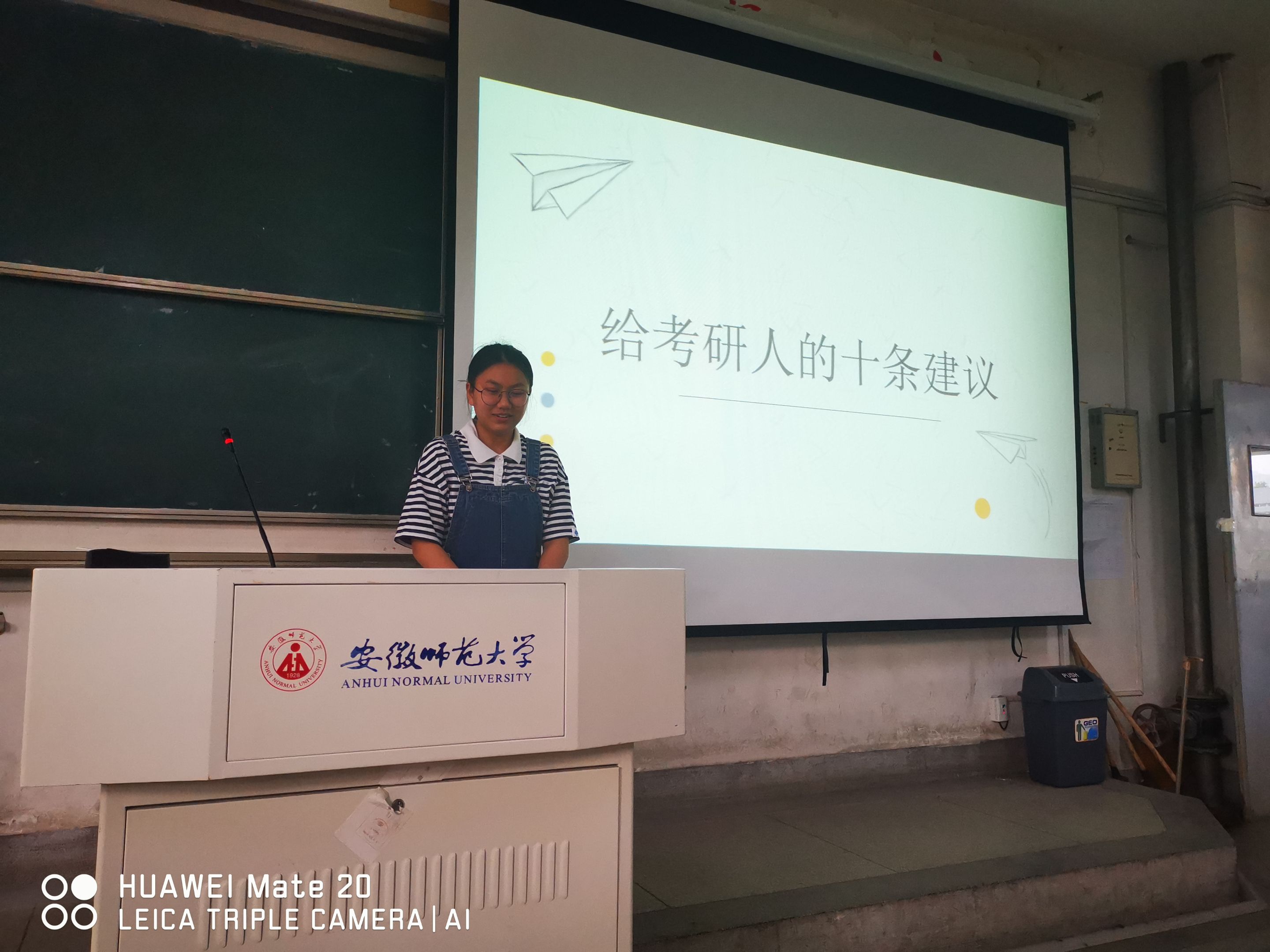 曾梦蝶同学考取安徽师范大学学前教育专业。分享交流过程中,她为准备考研的同学提供了思路清晰、可供借鉴的具体学科学习方法,并给出了每一关键时间段应当完成的学习进度,她表示,我们应当合理分析自己的学习能力以及学习水平,提前准备在学习过程中用大量重复的手段来强化知识的记忆。