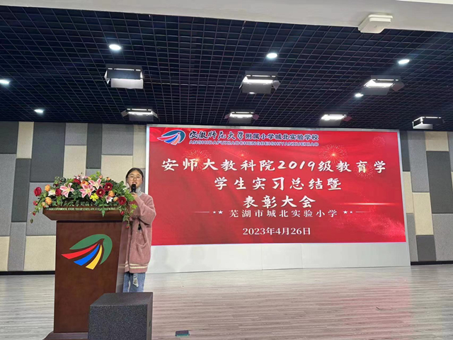随后,秉持着公平公正的原则,专业与实习学校综合考虑后,评选出徐美宣、梅文娟两位同学为“卓越实习生”、张红创、严中然、王燕等十位同学为“优秀实习生”,由校长严慧颁发荣誉证书。“卓越实习生”代表梅文娟同学发言,她从教育教学、班级管理、教研活动三方面回顾收获,并向实习学校表达了真切的祝福和感谢。