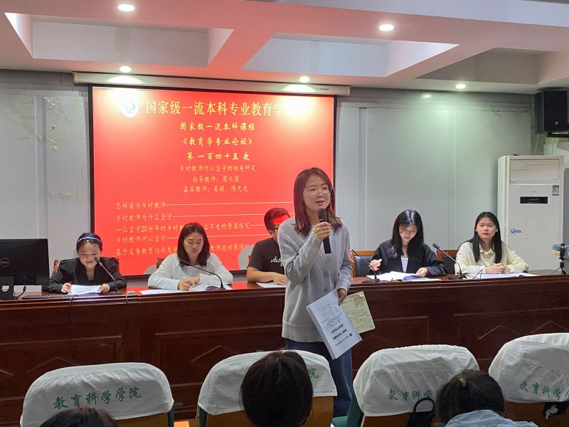 本次论坛张紫涵小组以“乡村教师何以坚守的相关研究”为主题展开讨论。第一位汇报人彭斓以《怎样留住乡村教师——基于赫茨伯格的“双因素理论”分析》为题,在赫茨伯格的“双因素理论”基础上,探究乡村教师流失的原因并提出相应对策。第二位汇报人王可根据《乡村教师为什么坚守——基于一位乡村教师的个案调查》的主题,以坚守乡村多年的人民教师王伟为调查对象,运用观察法和访谈法,分析乡村教师坚守的内外原因。第三位汇报人胡镔以《一位坚守20余年的乡村教师为什么不走的原因探究》为题,借助马斯洛需要层次理论进行访谈设计,并利用nvivo软件对访谈资料进行编码,最终得出乡村教师坚守的原因在于爱与归属感以及尊重需要的满足。