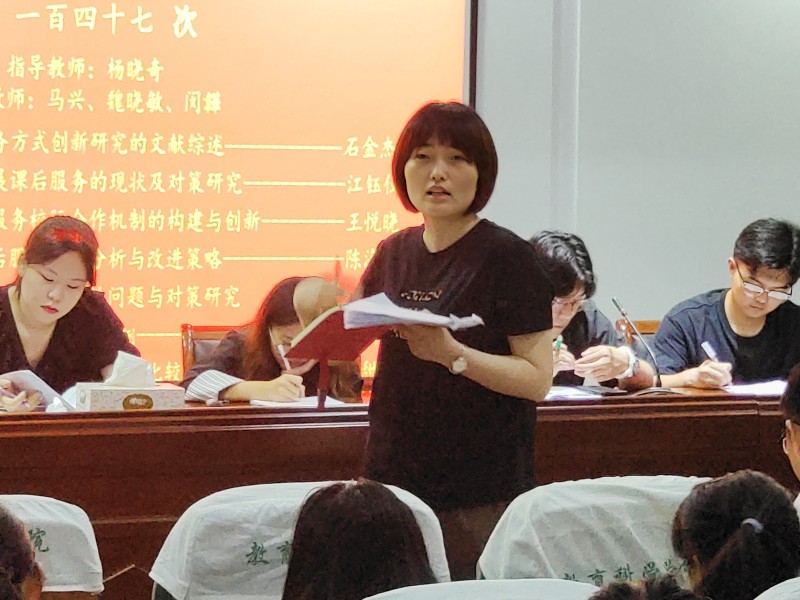第四位汇报人陈海龙根据《“双减”背景下小学学校课后服务现状分析与改进策略》这一主题,借助问卷法和访谈法,探究小学学校课后服务现实状况,并从实施理念、实施机制和评价系统三个方面归纳小学课后服务现存问题并提供改进策略。第五位汇报人王琪森以《“双减”背景下乡村小学课后服务内容的问题与对策研究——以A省F市L小学为例》为题,以一所乡村小学为调查对象,分析乡村小学课后服务存在问题及产生原因,并提出针对性的解决对策。第六位汇报人王甜甜围绕《“双减”政策背景下小学课后服务的城乡差异比较研究》的主题进行汇报,综合运用问卷法、访谈法以及观察法调查两所城乡小学课后服务开展现状,并进一步分析城乡差异产生的原因,提出相应改进措施。