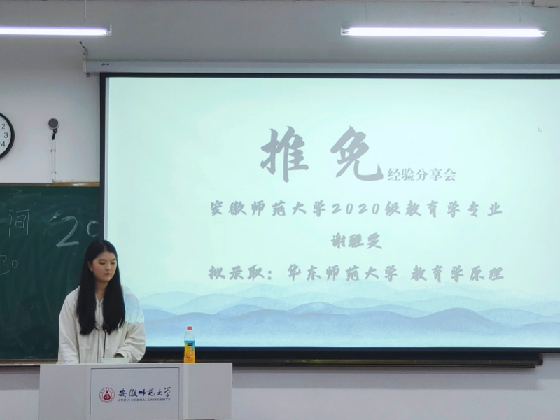 为帮助教育学专业同学进一步理解教育学学术人才的培养定位,更多投入到专业学习,为攻读研究生做好学业准备,教育学专业于10月11日晚在教学楼1302教室召开专业推免经验交流分享会。会议邀请到四位已成功推免的20级教育学专业学生。其中,谢雅雯推免至华东师范大学教育学原理方向,纪岚推免至华东师范大学成人教育学方向,石金杰推免至东北师范大学高等教育学方向,王悦晓推免至南京师范大学职业技术教育学方向。会议由21级教育学孙宇主持,21级、22级教育学专业部分学生参加。