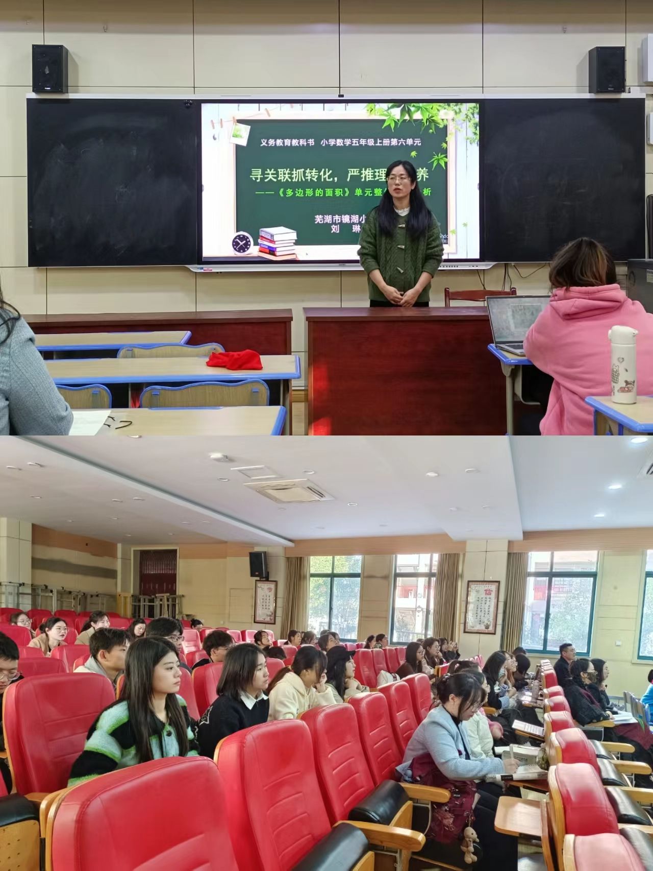接着,由刘琳老师主讲单元整体教学分析讲座,以小学数学人教版五年级上册第六单元《多边形的面积》为例,首先介绍了该单元的课标要求,将单元内容从横向和纵向进行分析比较,同时利用人教版教材的编排特点引出单元的整体教学目标,展示了新的课时划分方法。最后,刘老师对此次讲座内容和想法进行总结,再次强调了转化思想在小学数学教学中的重要地位。