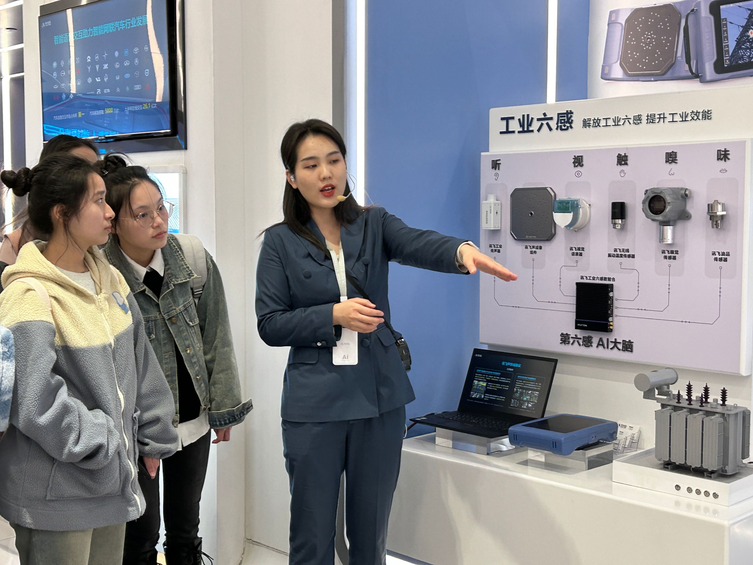 刚步入科大讯飞的办公大楼,一个声音就传来。只见一位虚拟主播在荧屏上与同学们打招呼,据工作人员介绍,这位主播是科大讯飞的虚拟主播“小晴”,她是由科大讯飞的语音合成、语音识别、语义理解、口唇预测等多种人工智能核心技术综合打造而成,还可以根据需求切换人物形象。在体验馆里,同学们了解了科大讯飞人工智能技术在教育、医疗、交通等多远领域的创新应用,例如讯飞星火大模型、讯飞人工智能+智慧教育产品、智慧医疗产品等,与各种人工智能技术来了一次近距离接触。