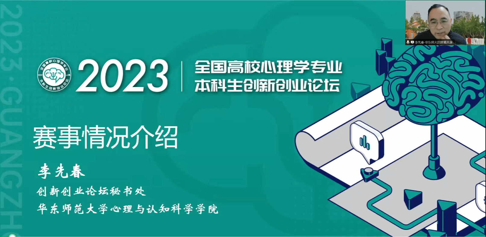 随后,李先春教授向与会师生详细介绍了创新创业论坛。他指出,本论坛由教育部高等学校心理学类专业教学指导委员会主办,其宗旨是落实立德树人根本任务,助力学生掌握基本理论、研究技能与实践应用,提升科学研究与实践转化能力,鼓励开展跨学科研究工作,加强团队合作精神,注重交流与沟通能力训练,展示心理学魅力与科研创新成果,传播产学研融合的最新理念,从而强化心理学解决关键科学问题和回应国家重大战略和社会需求的能力。同时,作为创新创业论坛的执行主席,李先春教授向大家详细介绍了论坛的主要流程与实施办法、各分论坛的开设思想与选拔主旨、本年度论坛的组织筹备情况与最新动态以及论坛的相关注意事项等;他还展示了自202012月以来论坛筹备工作组细致严谨的工作历程,以及前两届创新创业论坛的成绩,并指出前两届论坛中的相关作品充分展示了新时代我国心理学子们的扎实专业素养、创新思维与实践转化能力,也彰显了心理学解决关键科学问题和回应国家重大战略和社会需求的愿景和能力。