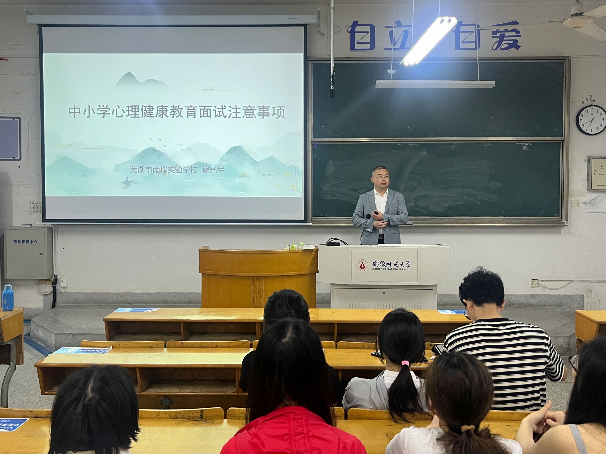 为培养师范生的教育教学技能,进一步提升心理学专业学生的中小学心理健康教育面试应考能力,5月8日晚,心理学专业于田楼8210教室举办2024年度教学技能大赛启动暨心理健康课示范指导会,特别邀请芜湖市南瑞实验学校校长助理、弋江区心理健康教育工作站站长翟光军老师为同学们开展“中小学心理健康教育面试注意事项”专题讲座,2022级心理学专业本科生参加此次会议。会议由心理学专业负责人王礼军主持。