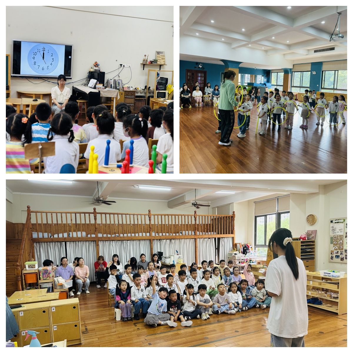 林璐、徐晶磊、石欣悦、欧阳晨烨、董晶、施宇新、刘佳琪、俞琦颖八位实习同学在指导教师指导下精心准备。先后在所实习班级依次进行了小班语言活动《神奇的变色龙》、中班美术活动《田园好风光》、中班数学活动《点点变变变》、大班数学活动《一分钟有多长》、小班体育活动《圈圈乐》、中班语言活动《嘘!保密》、大班语言活动《小心!别上当》、小班美术《情绪小怪兽》的公开课展示。