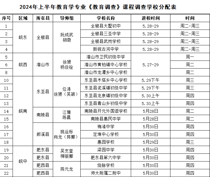 为培养学生的合作探究意识和实地调研能力,了解一线教育的真实情况,掌握教育调查的基本原理和方法,教育学专业开设了《教育调查》特色实践课程。5月27日至31日,2021级、2022级教育学专业全体本科生共73人分为13个调查小组,赴安徽省肥东县、肥西县、全椒县、潜山县、南陵县、郎溪县、东至县七个县区的二十所乡村寄宿制学校开展2023-2024学年第二学期的《教育调查》实践课程。此次调研由各小组指导教师吴支奎、姚运标、徐赟、柳丽娜、杨俊铨、肖龙、江珊、胡微、陈晨、陈元龙、位涛、吴颖及郑梦娜博士带队参与,课程负责人滕曼曼和十位研究生助教一同前往。