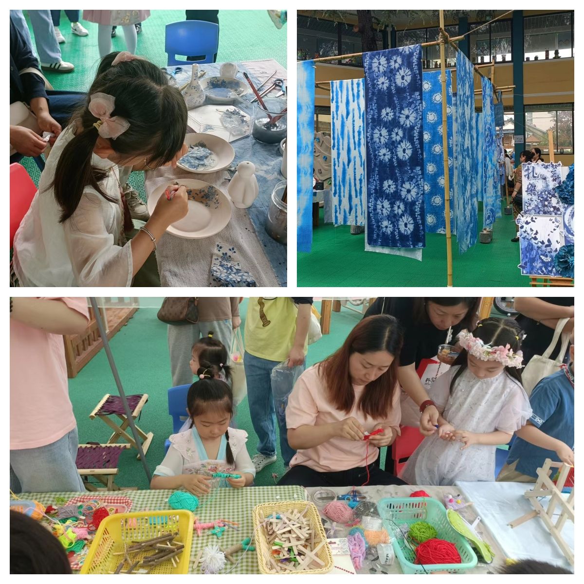 幼儿在不同的区域“各显身手”,尽情享受节日的快乐。扎染区里幼儿正在合力制作染布;陶艺区的幼儿在爸爸妈妈的陪伴下一笔一画勾画出生动的图案;编织区的小朋友“一针一线”地缝制着自己的“艺术品”;义卖区的幼儿站在他们制作的手工艺品前叫卖着,俨然一个个小店主,时不时还给前来购买的顾客解释他们的作品。游园活动义卖所筹款项将全部捐给福利院的孩子,这一活动让幼儿体验爱、感受爱。