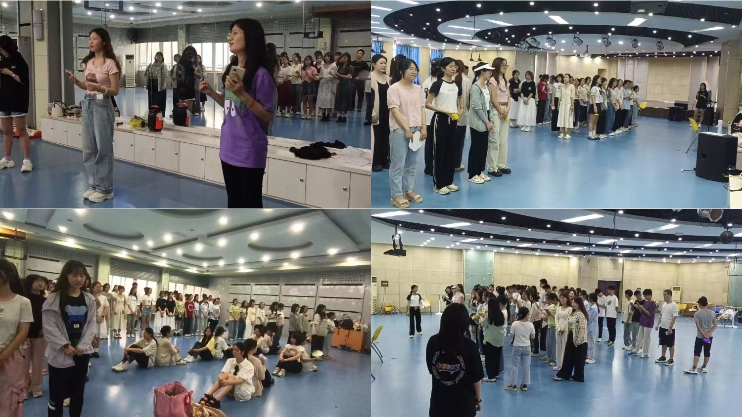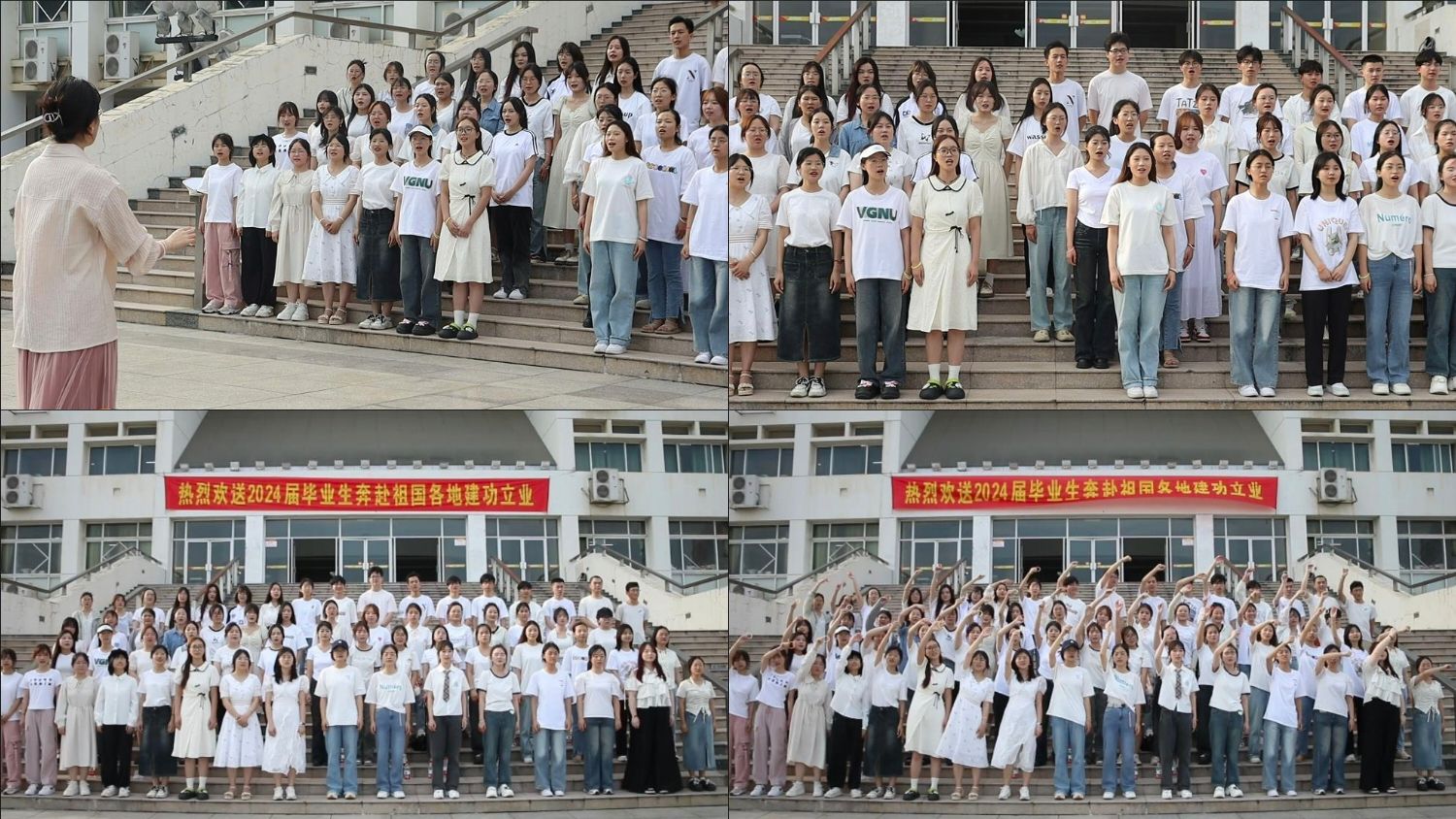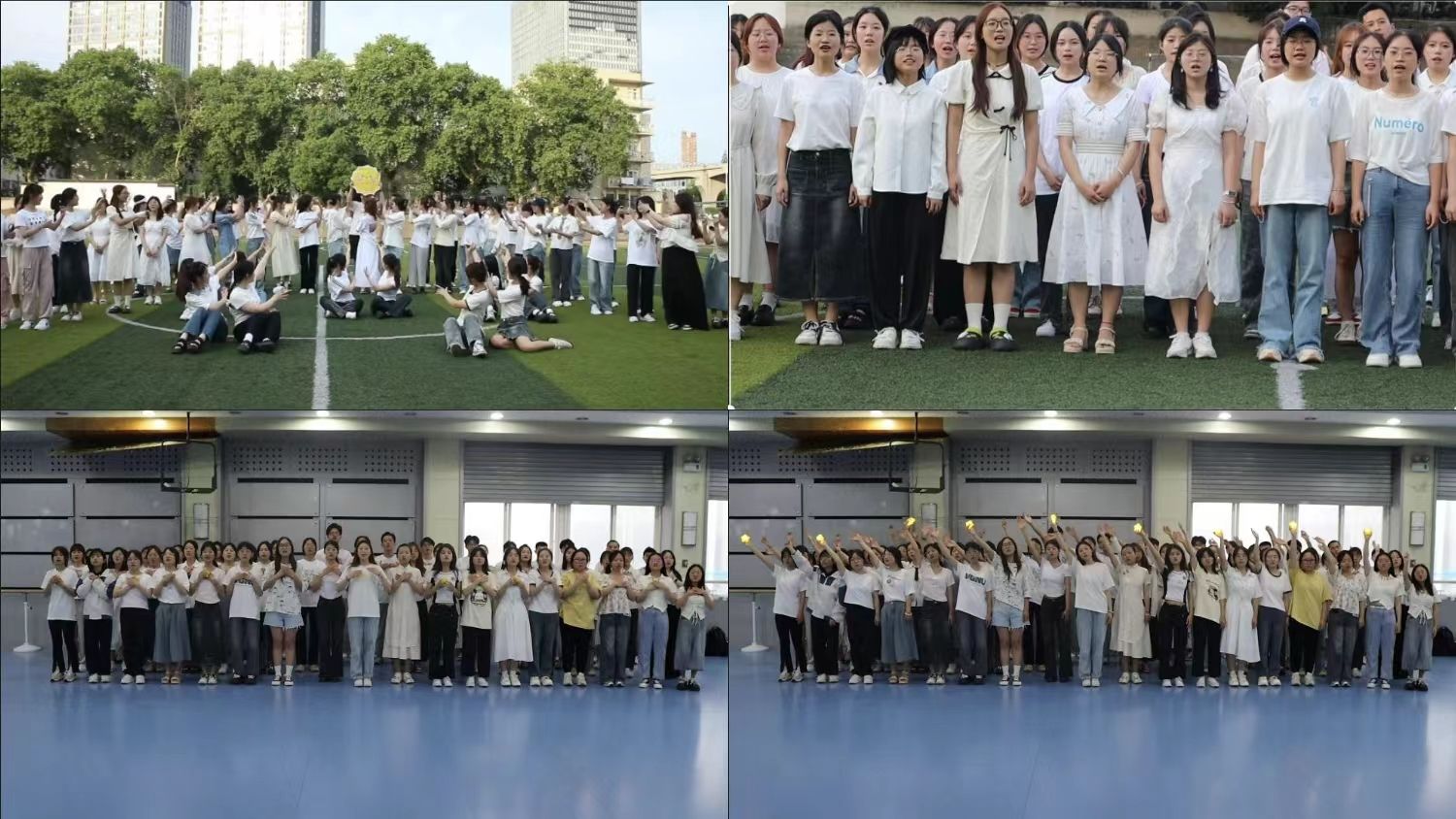 方案确定好以后,学生集体进行排练,包括练习合唱、队形的站位和变换,并在舞蹈室、田楼前和操场等不同场地多次进行视频拍摄,具体到每一个动作的规范性、每一句歌词的音准。视频由2021级教育技术学杨梦芹和吴高杰同学帮助拍摄,后期的视频剪辑由全体班委分工制作,从画面、音效的呈现与转换,素材的穿插,到特殊的动画效果,大家精心对每一处细节进行打磨。