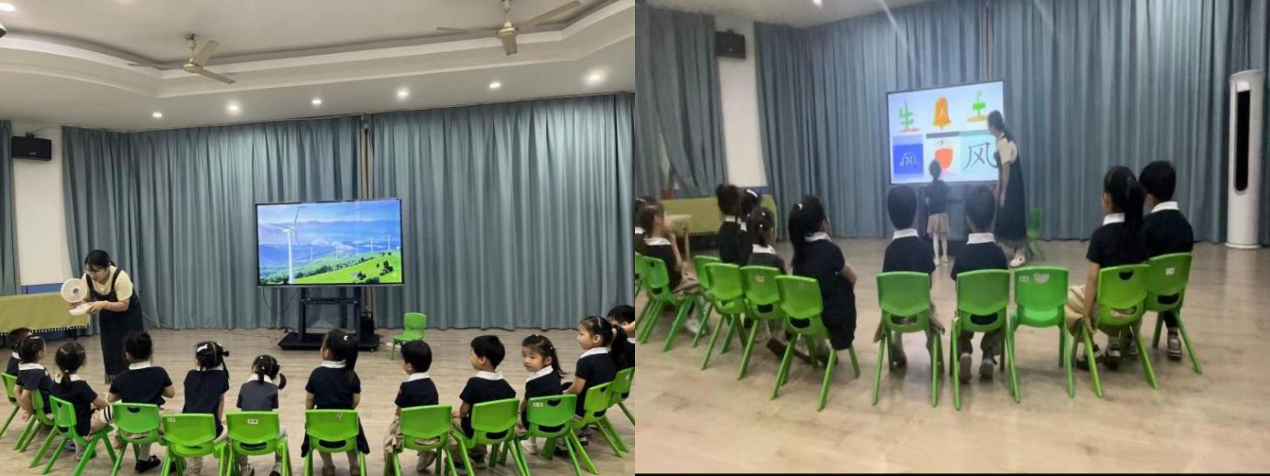 公共课展示开始,陈笑笑老师组织中班科学活动《有趣的风》,通过播放风声、感受电风扇的风力变化、认识不同种类的风(如微风、大风、狂风、龙卷风)及模仿风的身体动作游戏,带领孩子们用身体动作全方位体验“风”的奇妙。孩子们还通过观看视频初步感知汉字“风”的外形特征,感受书法的艺术之美。整个过程生动有趣,孩子们都乐在其中。