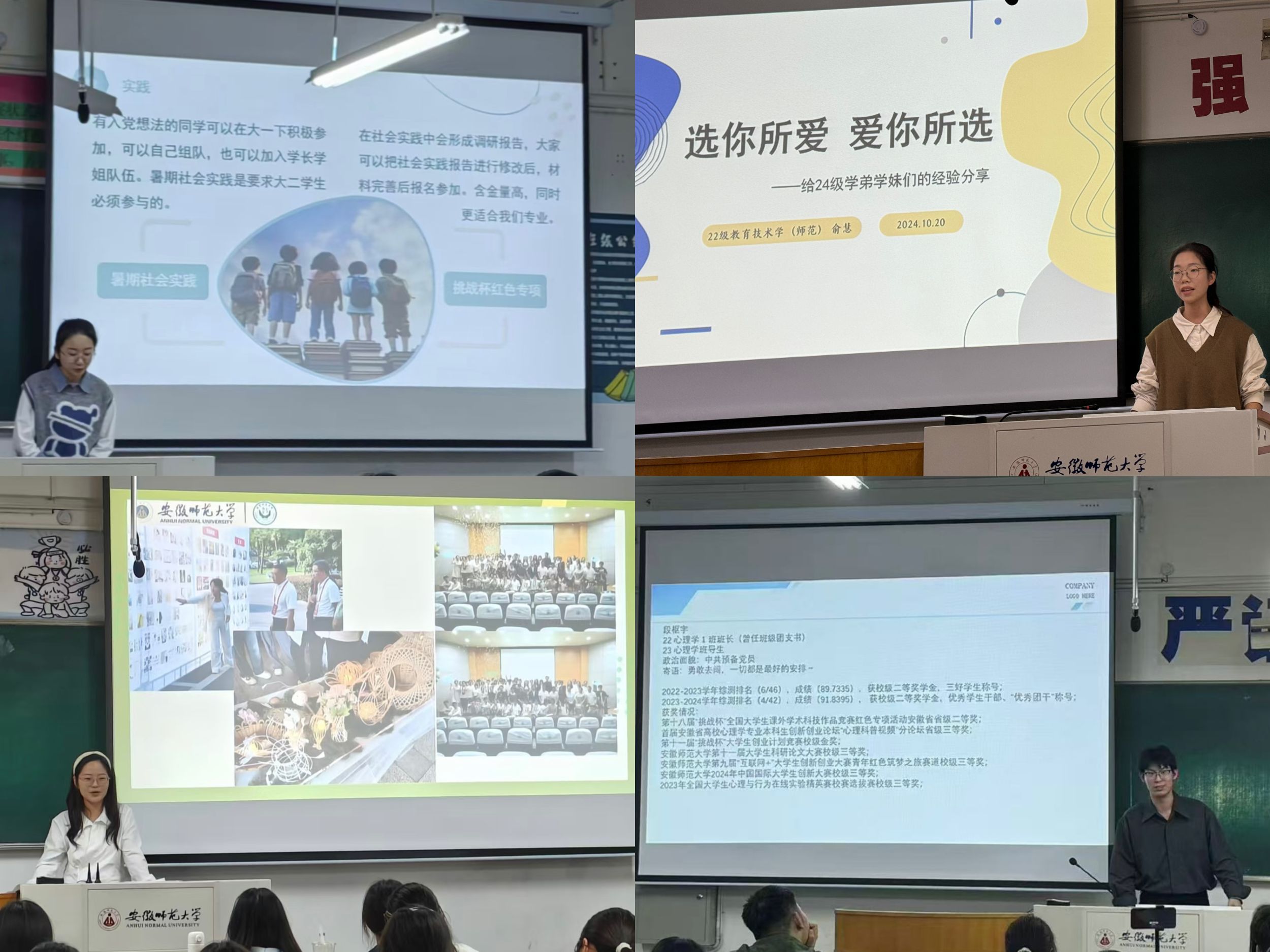 为帮助新生尽快适应学习生活,转变新角色,提高学习能力。2024级教育技术学、心理学、小学教育三个专业分别邀请22、23级优秀学生代表进行学习经验分享。