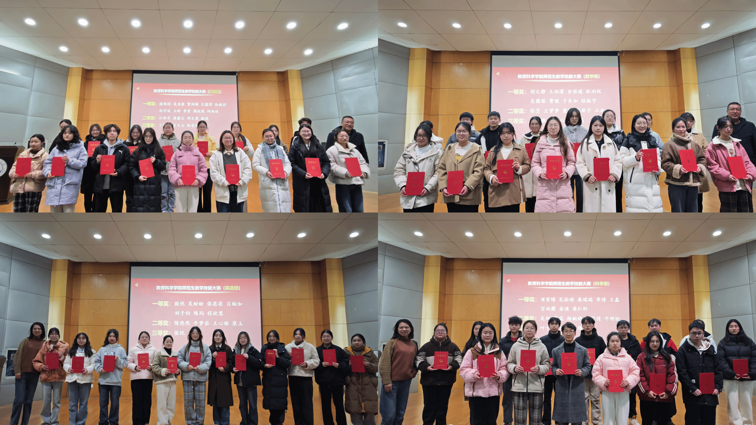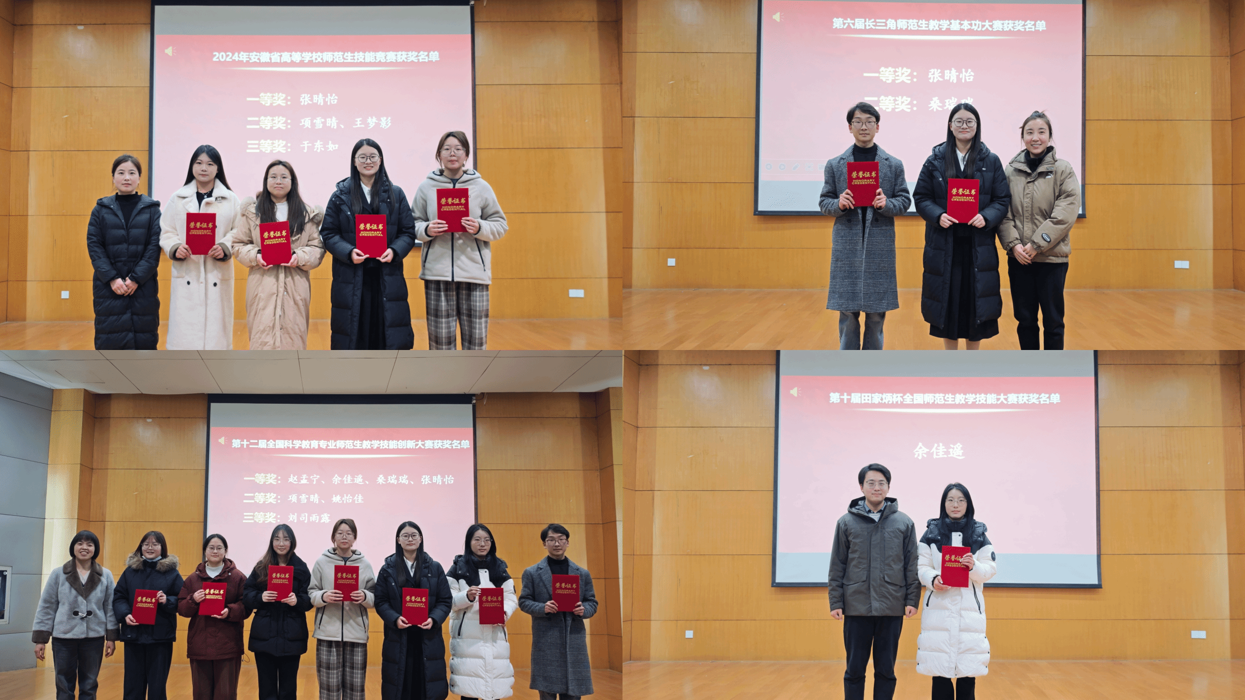 本次颁奖典礼分设六个项目,分别授予在教育实习、学院师范生技能大赛、安徽师范大学第二十一届师范生技能大赛、第六届长三角师范生教学基本功大赛、第十二届全国科学教育专业师范生教学技能创新大赛、第十届“田家炳杯”全国师范院校师范生教学技能竞赛中表现优异的同学,共143人次,其中获省级以上各类教学技能大赛一等奖6项、二等奖5项、三等奖3项,创历史最好成绩。每一个获奖者都面带笑容,洋溢着自豪和喜悦,他们用勤奋和汗水,换来了这份荣誉,给专业增添了更加动人的亮色。