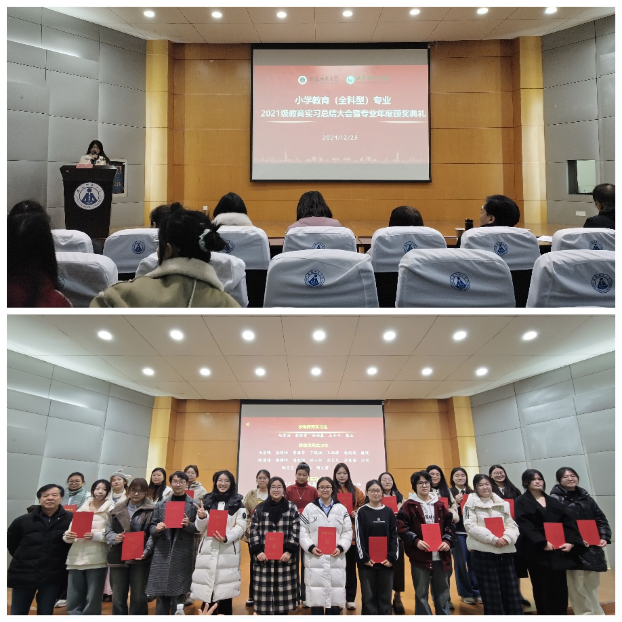 为充分发挥榜样的示范引领作用,激发学生们的求知热情,推动专业形成积极进取的优良学风,12月25日下午,小学教育(全科型)专业在田楼报告厅举行了2024年度专业颁奖典礼。专业负责人王芳老师和姚运标、杨晓奇、谈力群、徐群、陈晨、魏晓敏、马兴老师及辅导员程雅楠、张理强老师与全体获奖同学、学生代表齐聚一堂,共同见证了这一激动人心的时刻,共同感悟了专业发展的成绩与荣耀。