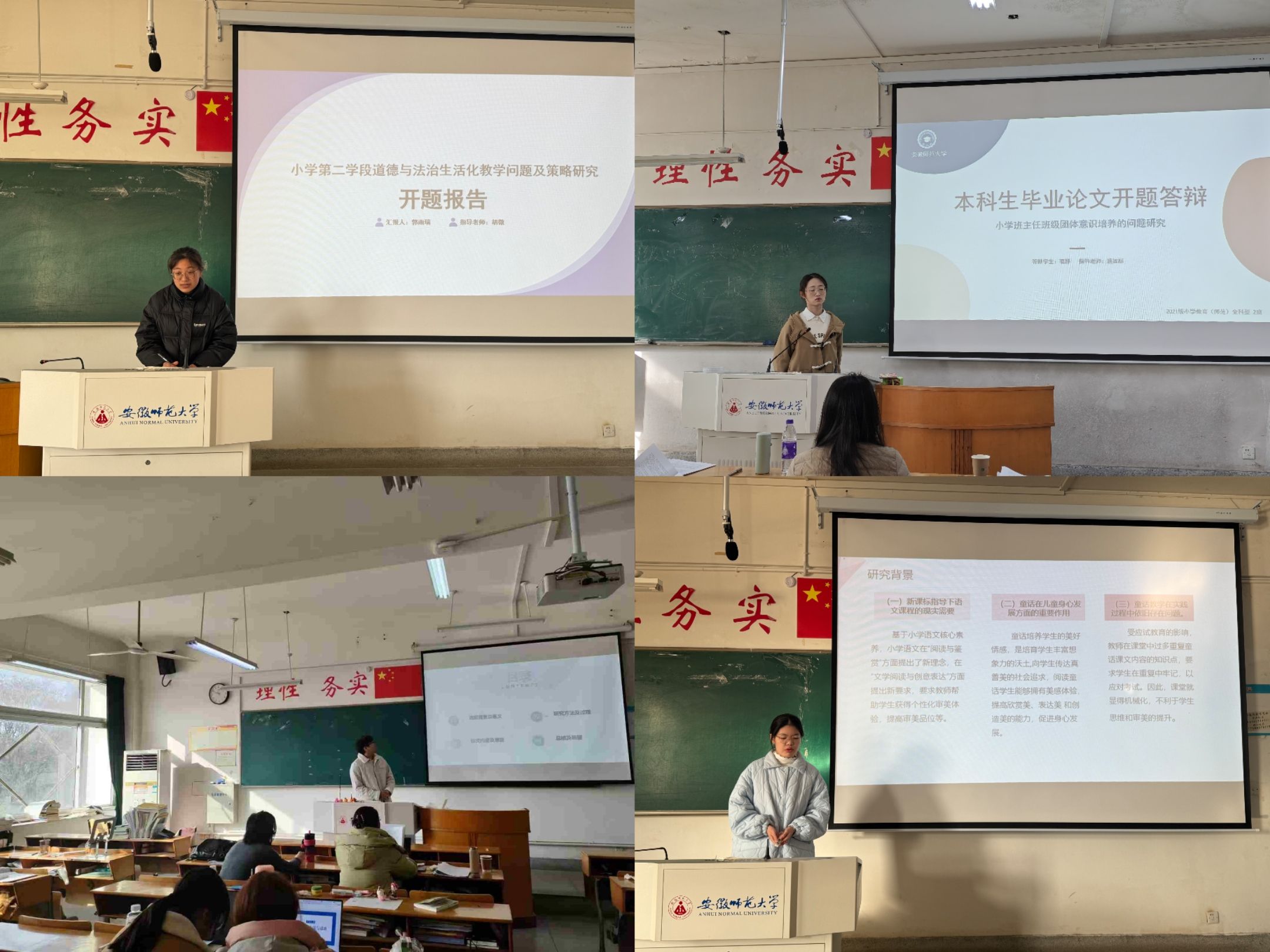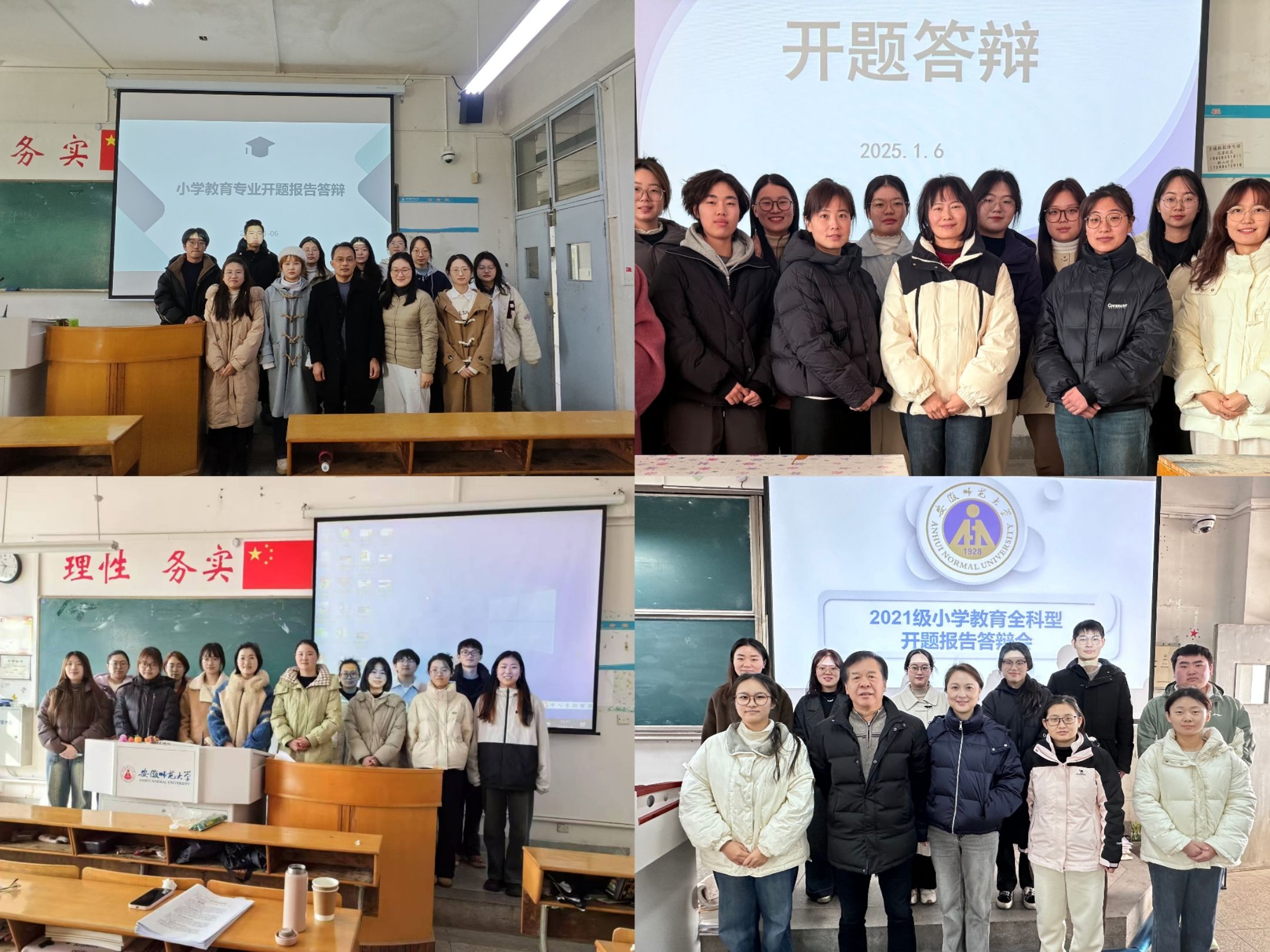 为保障本科毕业论文撰写工作顺利开展,2025年1月6日上午,21级小学教育(全科型)专业在田楼8201、8203、8205等教室举办毕业论文开题报告会,分九组同步进行,共18位指导老师参与本轮开题报告答辩。