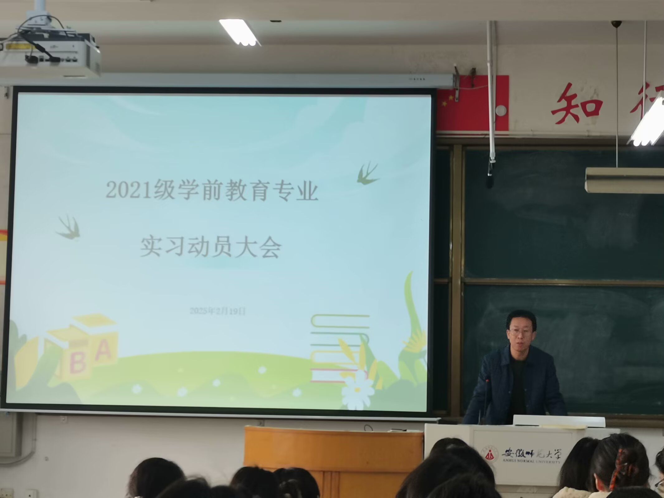 为推动实习工作顺利开展,2月19日下午在田楼8306教室顺利召开2021级学前教育专业实习动员会,专业负责人王成刚、2021级辅导员赵茜和2021级学前教育专业全体本科生参加了本次会议。