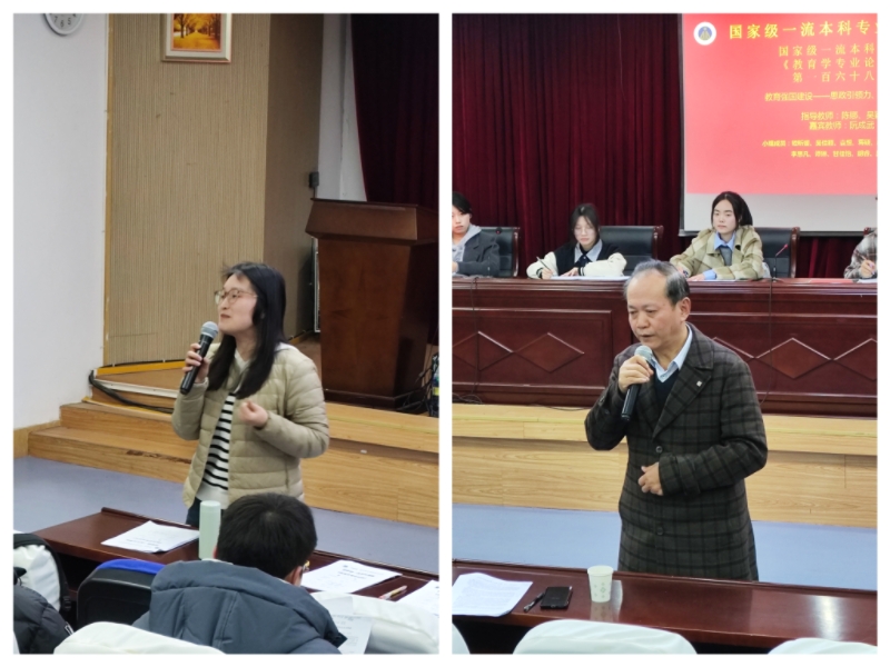 在教师点评环节,指导教师陈娜首先强调专业论坛课程旨在让学生有所思、有所学,培养学术能力,受启迪并深入思考。她以思政引领力选题为例,最初计划是先讲其内涵再逐一发展论述等,但因思政课而改变,后聚焦到高校思政课。小组考虑到人工智能带来知识幻觉,影响价值共识和价值观培育,最终选定“数智技术如何赋能高校思政课堂教学创新”这一选题。紧接着,她对两组选题进行评价。第一组选题虽有价值,但文本存在问题,很多内容未回答清楚。第二组选题文本短小精悍、内容丰富,但教育民生保障力概念可结构化定义,当前文本未清晰呈现其内涵具体方面,自己借助工具得到兜底保障力、质量提升能力、服务延伸力、教育应急力等方面内容供参考。