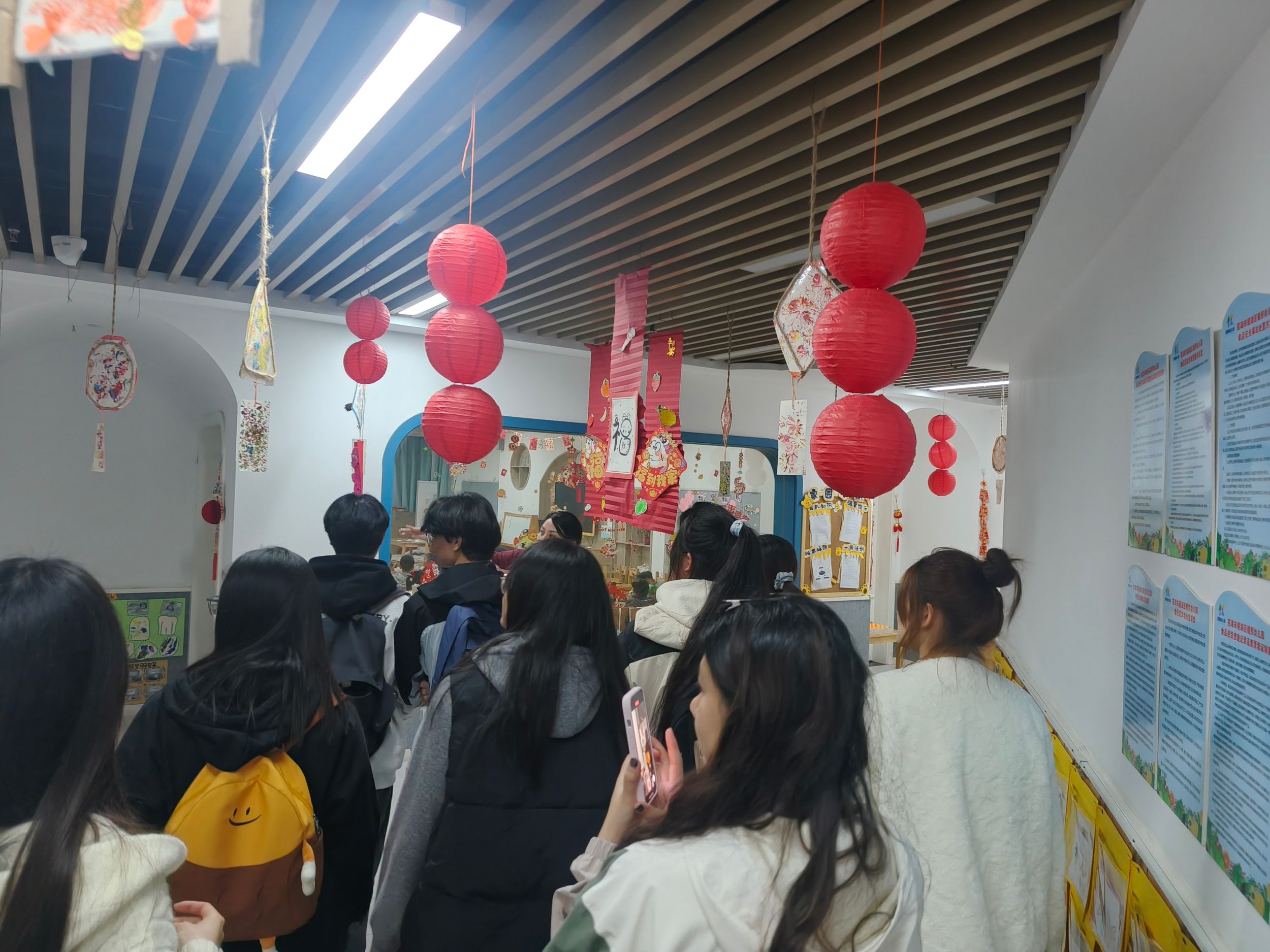 参观结束后,12名老师在大厅和同学们进行有序对接,并带领同学们分别前往各自见习的班级活动室,进行第一次观察活动。不论是大班、中班还是小班的孩子,都十分热情地迎接了同学们的到来。